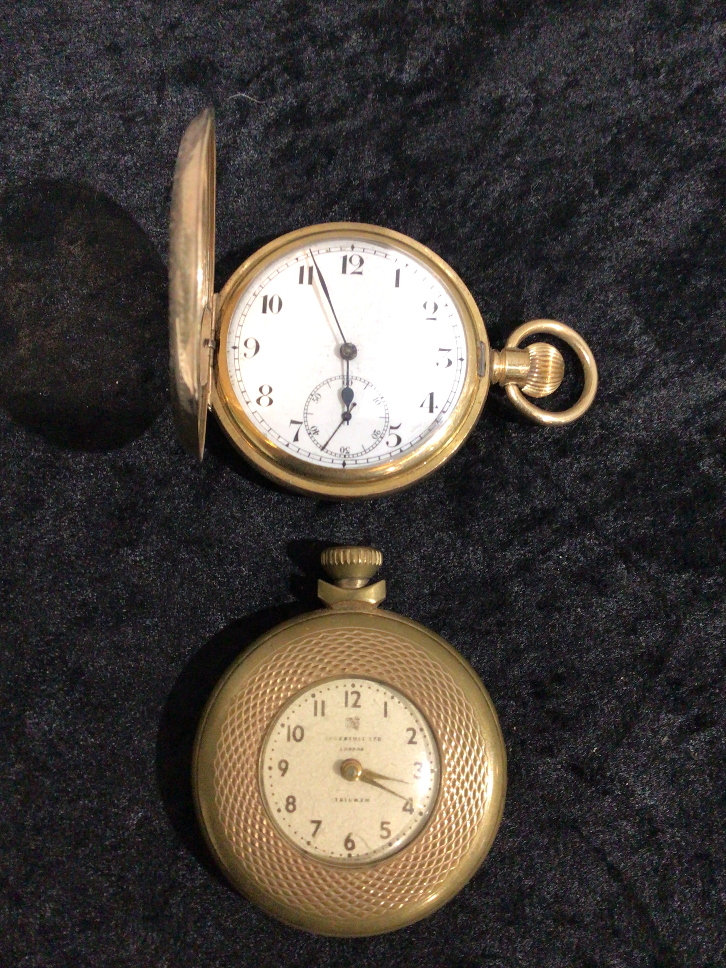 An Elgin gold plated full hunter pocket watch, featuring a classic white dial with black Arabic numerals and a subsidiary seconds dial at 6 o’clock. The interior caseback is marked “ILLINOIS WATCH CASE CO.”, “ELGIN U.S.A.”, “JW 17” (partially obscured), and the serial number “1213083”. Together with an Ingersoll Ltd. London ‘Triumph’ pendant-set pocket watch, its case adorned with an engine-turned crosshatch pattern. The cream-colored dial clearly displays “INGERSOLL LTD”, “LONDON”, and “TRIUMPH” below the 12 o’clock position, with black Arabic numerals.