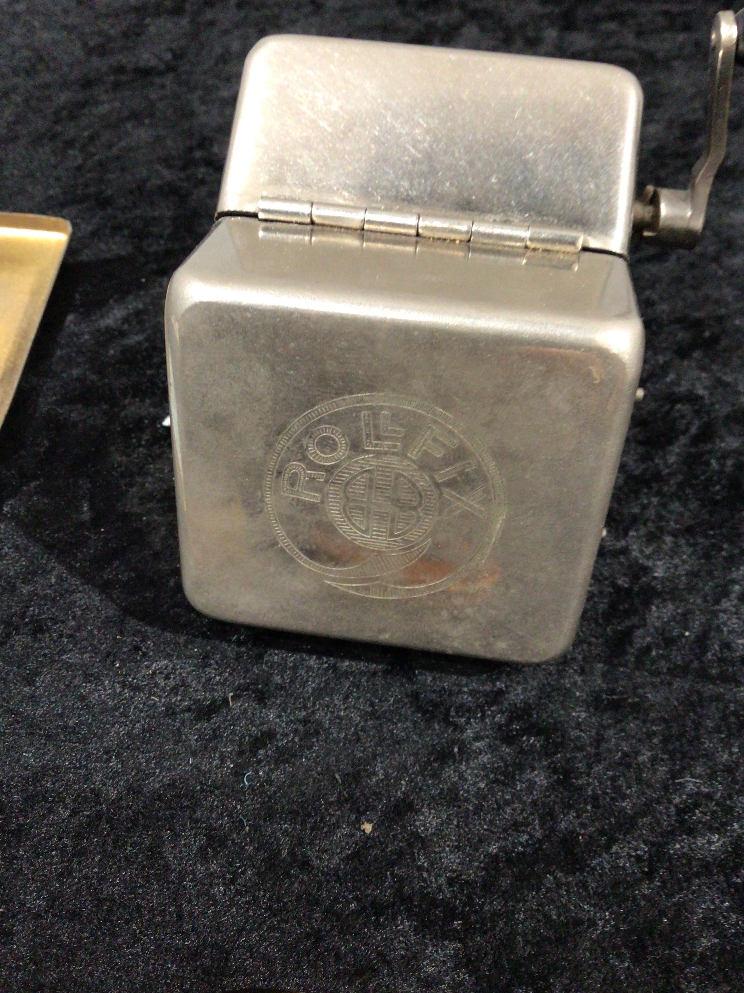 A German ROLLFIX / Rotbart Mond Extra Razor Blade Sharpener, circa 1930s, constructed from silver-toned metal, featuring a side crank and two internal rollers. Accompanying this is a brass-toned metal hinged cigarette case containing a “BACHELOR” brand matchbox with the text “CLOSE COVER BEFORE STRIKING”. The collection also comprises a small, round, wooden-cased compass with a white dial and a separate round wooden souvenir disc bearing an image of a castle and the text “REGALIA OF SCOTLAND”.