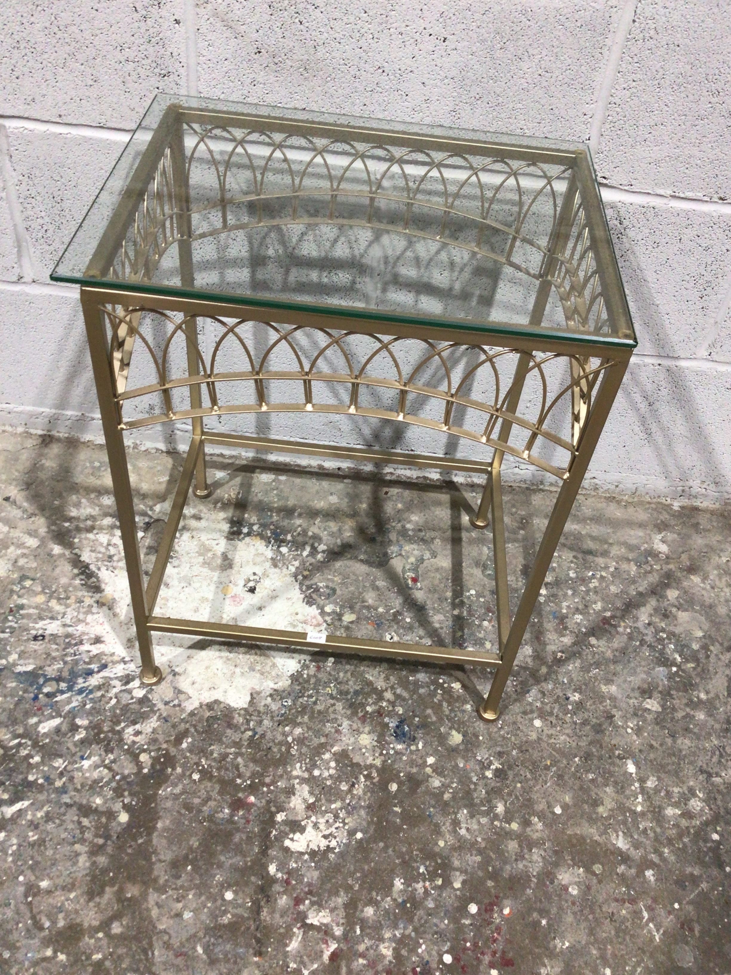 A Contemporary Gold-Toned Metal Side Table with Arched Lattice Work and Glass Top