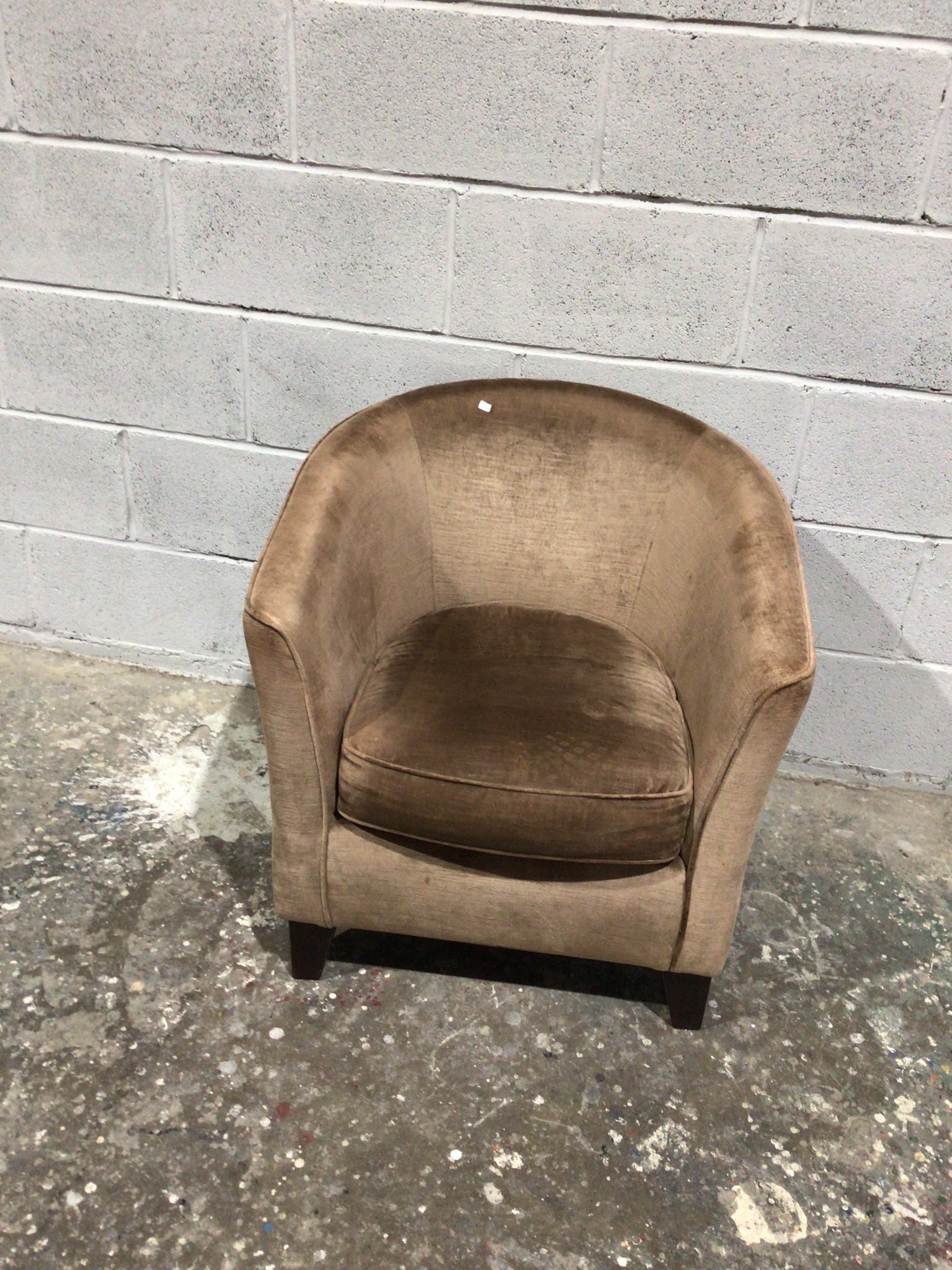 A Renwick Modern Upholstered Tub Chair, designed in a club or tub-style armchair form, featuring a continuous curved back and armrest. The chair is upholstered in a light brown or tan velvet or velour fabric and includes a removable seat cushion. It stands on short, dark-stained wooden legs. A small, illegible white sticker is adhered to the top edge of the backrest.