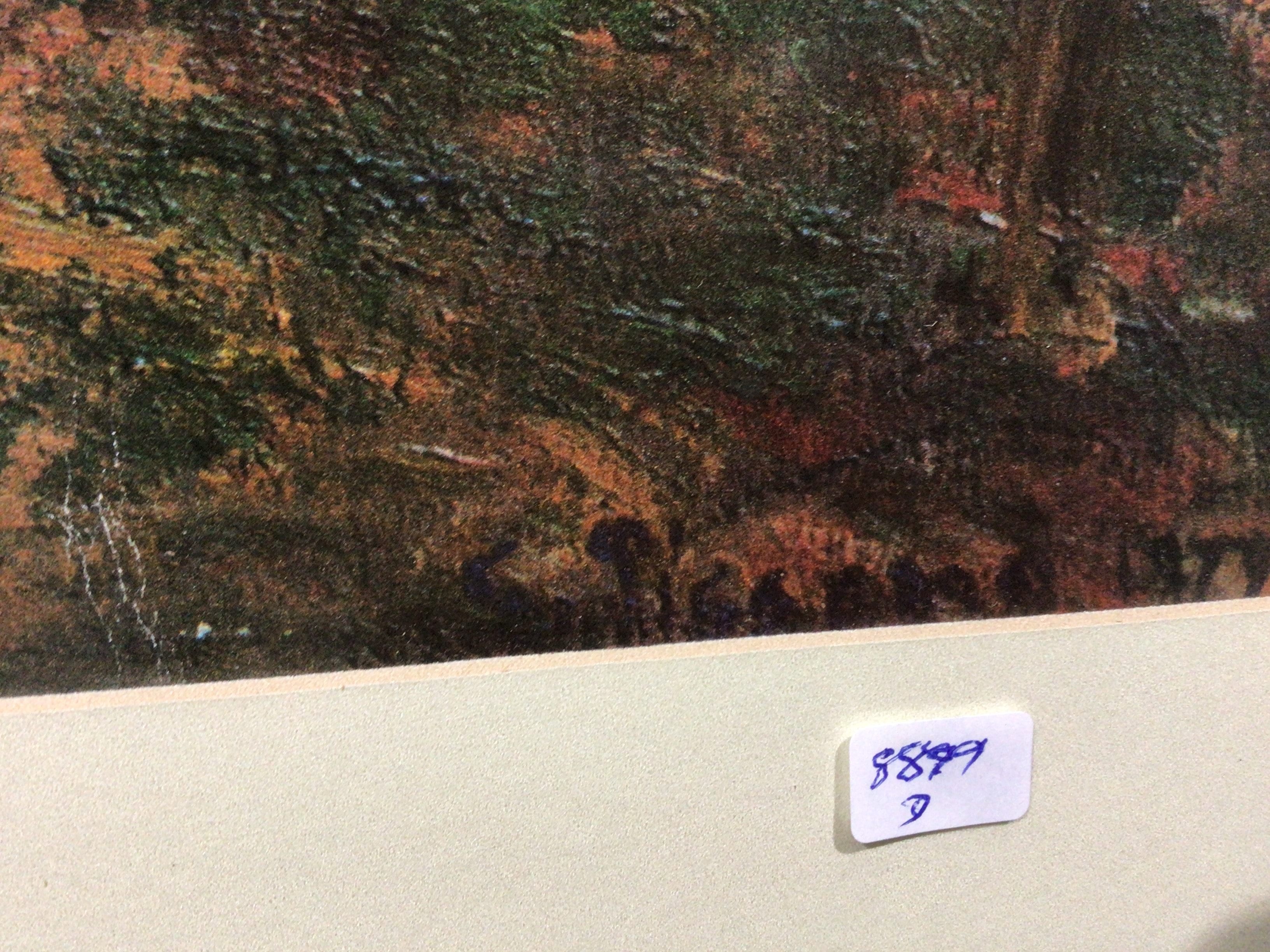 A framed print after Camille Pissarro’s ‘Red Roofs’, depicting an Impressionistic-style village scene nestled within a hillside forest with bare and leafy trees under a muted sky. The image is housed behind glazing, within a light-colored mat, and framed in a dark brown, possibly wooden or composite, frame. A small white label with handwritten blue text ‘9899 D’ is affixed to the mat board in the lower right corner.