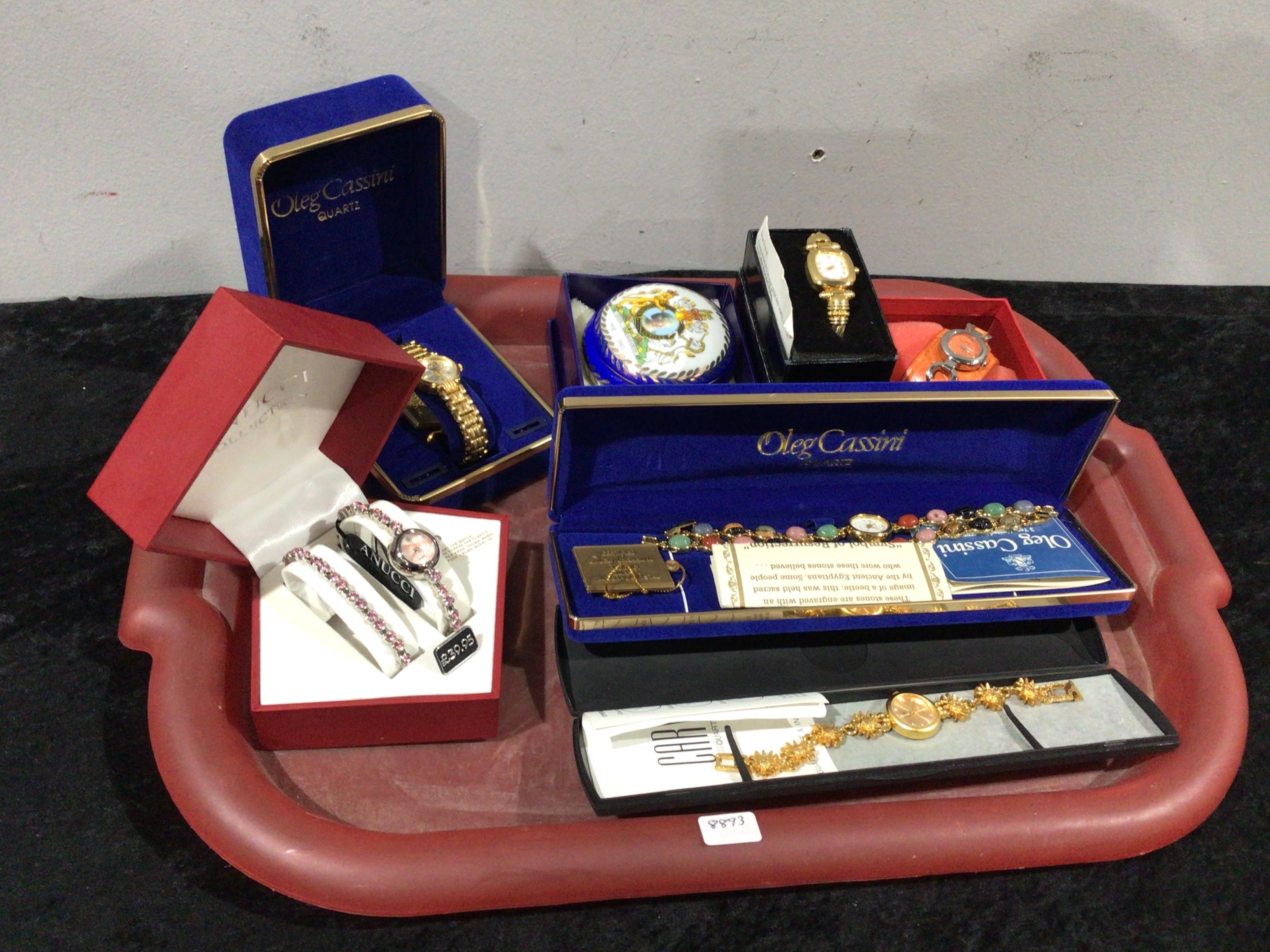 A collection of modern and contemporary wristwatches and various jewelry items, predominantly featuring pieces by Oleg Cassini and Anucci. The lot includes several gold-tone and silver-tone wristwatches, often with quartz movements and embellished with colorful stones or gems. One Oleg Cassini set comprises a watch and bracelet, accompanied by a tag indicating “Symbol of Resurrection” and referencing “Ancient Egyptians” in relation to the stones. An Anucci watch displays a visible price tag of “$39.95”. Also present is a small, colorful, round lidded trinket box, possibly enameled or porcelain. The items are presented in their original retail boxes atop a red plastic serving tray.