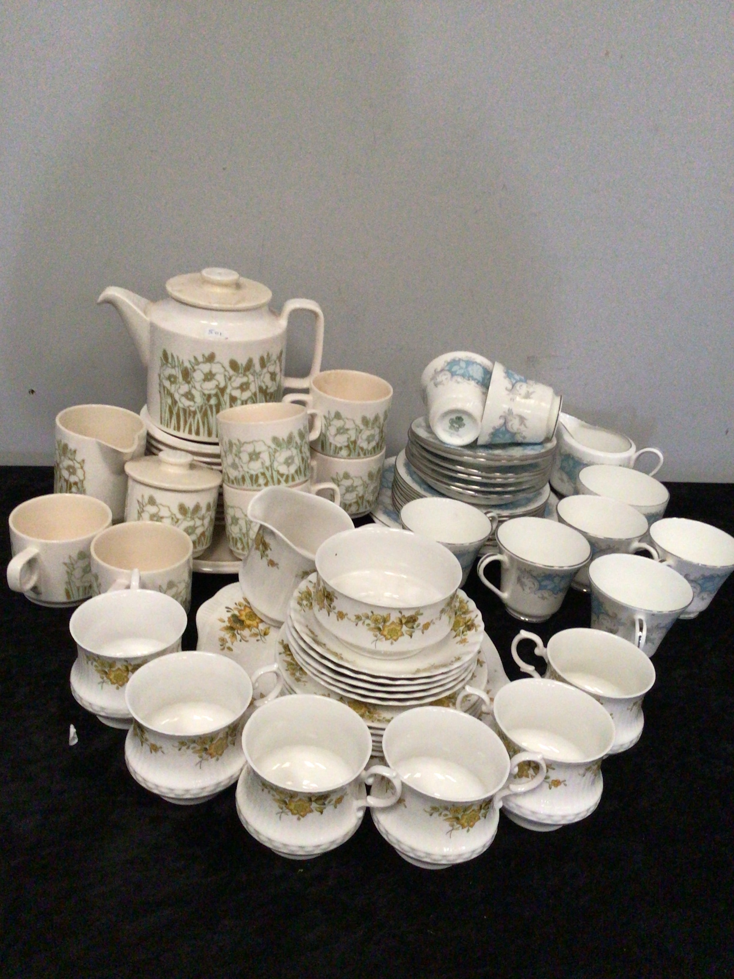 A comprehensive collection of assorted ceramic dinnerware and tea/coffee service items, comprising three distinct patterns. The primary group features a white ground decorated with a stylized green and yellowish-green floral motif, suggestive of wild flowers or grass, observed on a teapot, two mugs, two creamers, two lidded sugar bowls, and numerous cups and saucers. A second group of items, including cups and saucers and a creamer, displays a white background with light blue/grey scrollwork or abstract floral designs, potentially accented with metallic banding. A third distinctive style presents yellow/gold floral sprays on white pieces with a textured, possibly fluted or basketweave, exterior, observed on bowls and additional cups and saucers. A partially obscured price sticker, “50.-“, is visible on the teapot, and an illegible green backstamp is present on the base of one inverted cup.