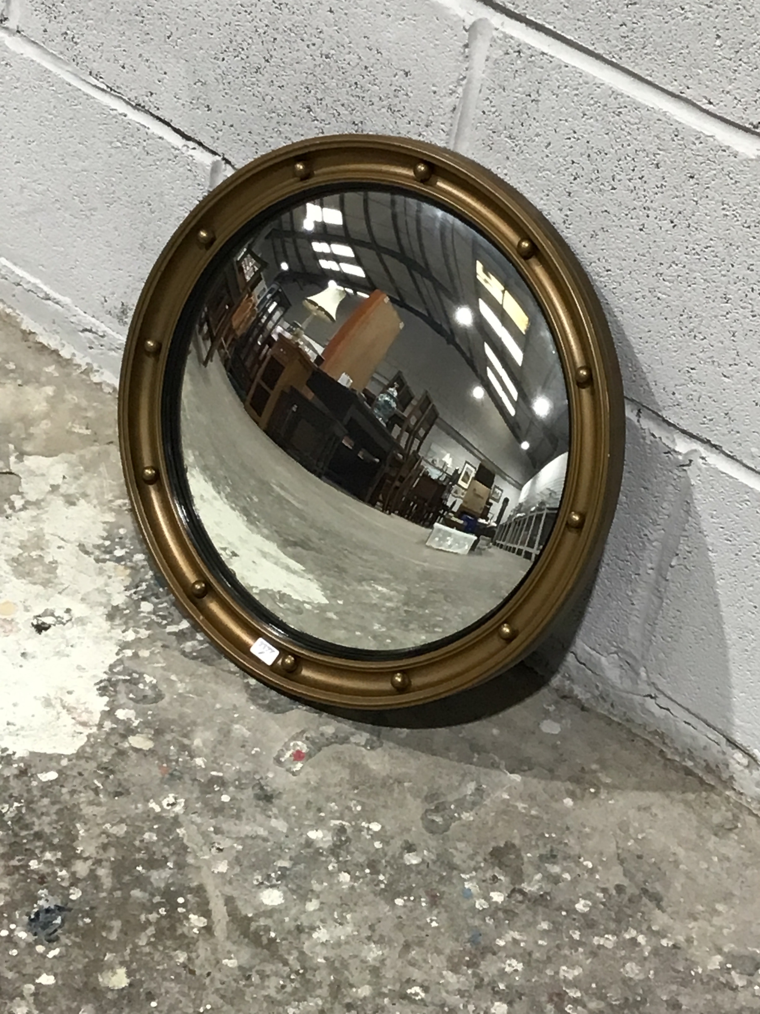 A circular convex mirror, commonly known as a “fisheye” or “bull’s-eye” mirror, presented in a 1920s style. The mirror is set within a robust, patinated brass or brass-toned metal frame, featuring a distinctive nautical or porthole design. The frame is characterized by a series of evenly spaced, domed studs or rivets around its outer circumference. A small, illegible white sticker with handwritten text is affixed to the lower left edge of the frame.