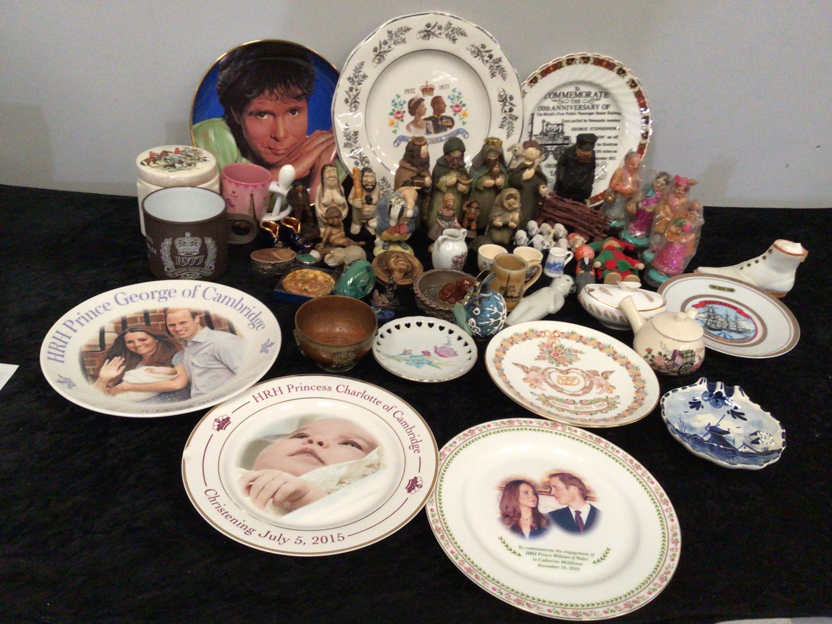 This lot comprises a diverse collection of approximately 30-40 decorative and functional items, predominantly crafted from glazed ceramic. Key pieces include several commemorative plates, with one identified through web intelligence as a Royal Worcester ‘HRH Princess Charlotte Of Cambridge Christening Collectible Plate’ (July 5, 2015). Other commemorative plates feature photographic transfers and printed designs related to the British Royal Family, such as “HRH Prince George of Cambridge,” an engagement plate for “HRH Prince William of Wales to Catherine Middleton November 16, 2010,” a “ROYAL BIRTH 1982” plate, a “1977” Silver Jubilee plate depicting Queen Elizabeth II and Prince Philip, and a “1952” plate. Further plates commemorate the “150th ANNIVERSARY OF The World’s First Public Passenger Steam Railway” mentioning “GEORGE STEPHENSON” (from 1825), and one featuring a portrait of a male figure resembling Cliff Richard. The collection also contains a variety of ceramic figurines, some resembling a Nativity scene, others appearing whimsical; several mugs, small bowls, decorative boxes, a small pitcher, and a ceramic shoe-shaped item. Visible materials are primarily ceramic, with various painted and transferware decorations, often with gilded accents.
