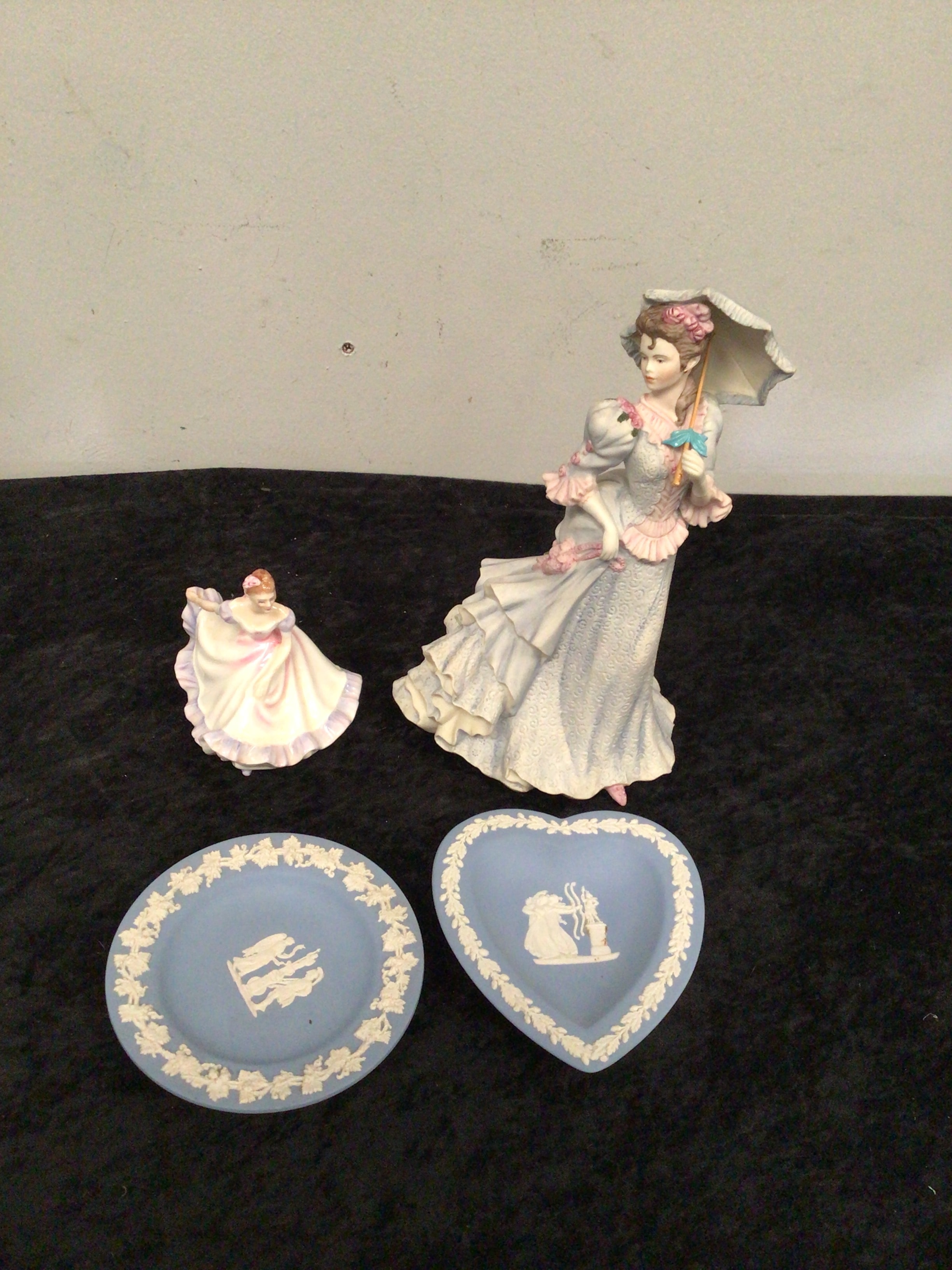 A Collection of Wedgwood Christina and Royal Doulton Ninette Figurines with Wedgwood Jasperware Dishes