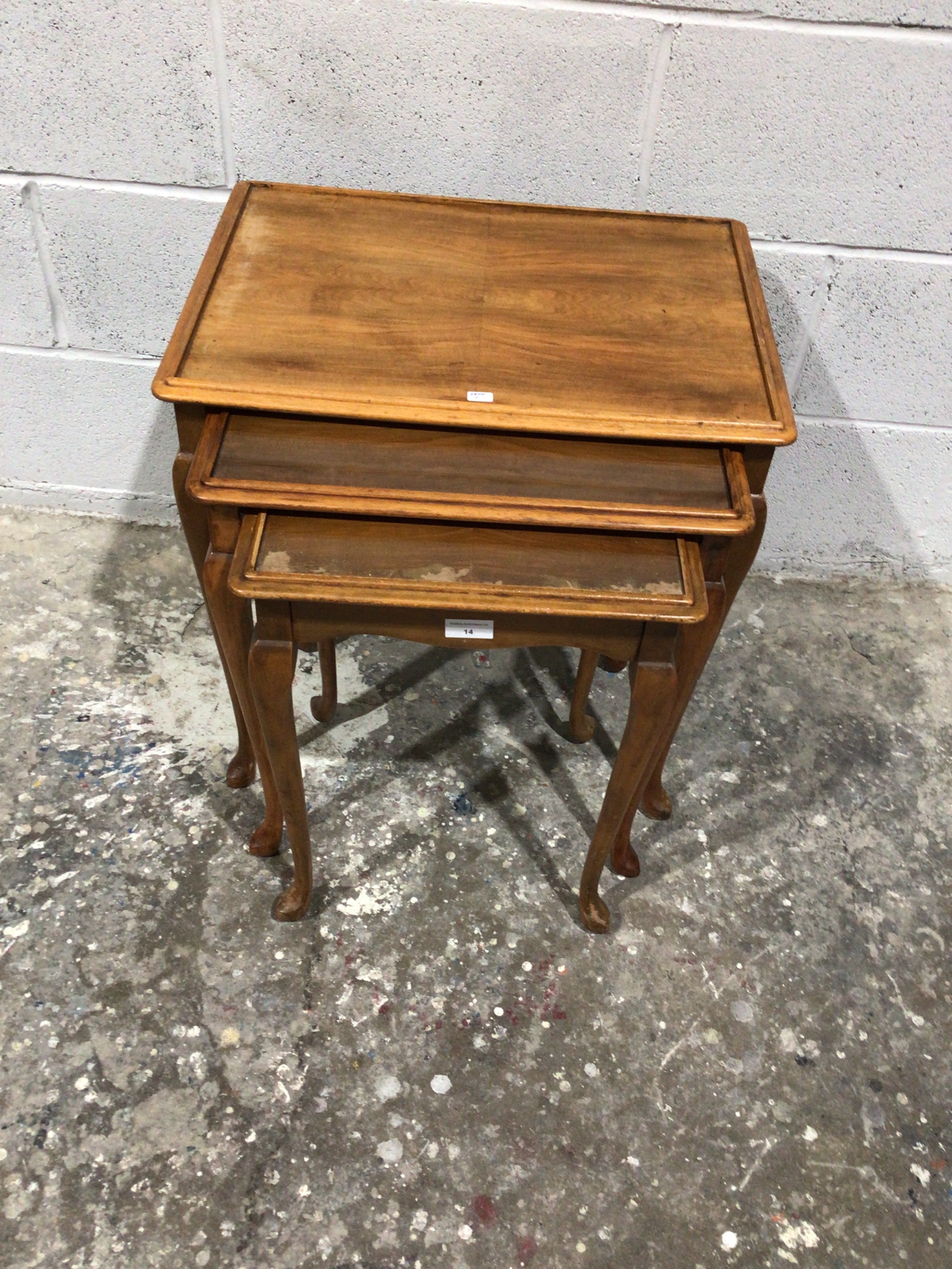 A set of three graduated wooden nesting tables, displaying a traditional or revival style, likely dating from the mid-20th century. Each table features a rectangular top with molded edges and cabriole legs. Constructed from a medium-brown stained wood, possibly hardwood. Small white adhesive labels are visible, with ’14’ on the smallest table, and a label on the largest table displaying ‘277’ and ’14’ along with faintly visible text identifying ‘Skylark Auctioneers Ltd.’