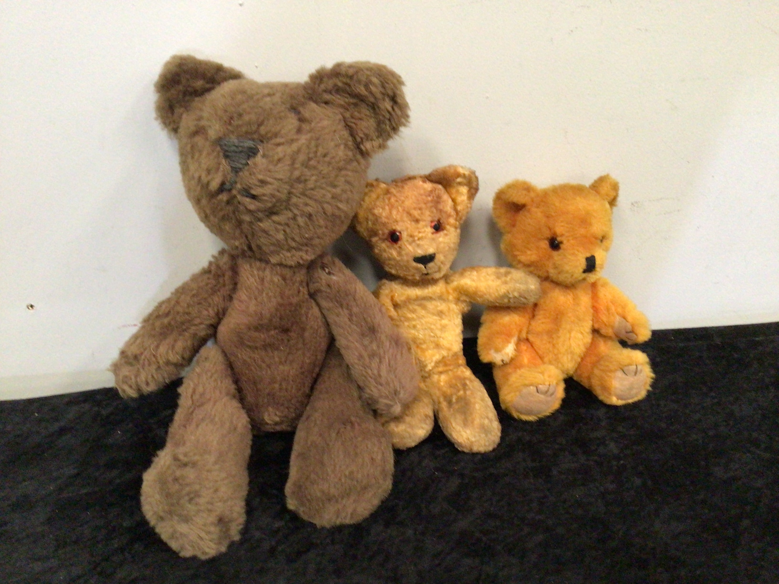 A group of three vintage jointed teddy bears of varying sizes, each featuring a traditional, articulated style. The largest bear is dark brown, while the two smaller examples are golden-brown and orange-gold, respectively. Each bear is fitted with bead or button eyes (dark on the largest, reddish-brown on the middle, black on the smallest) and stitched or felt noses. The plush material, likely mohair or a synthetic fiber, is consistent with period manufacture. No identifying text, labels, or manufacturer’s marks are visible.