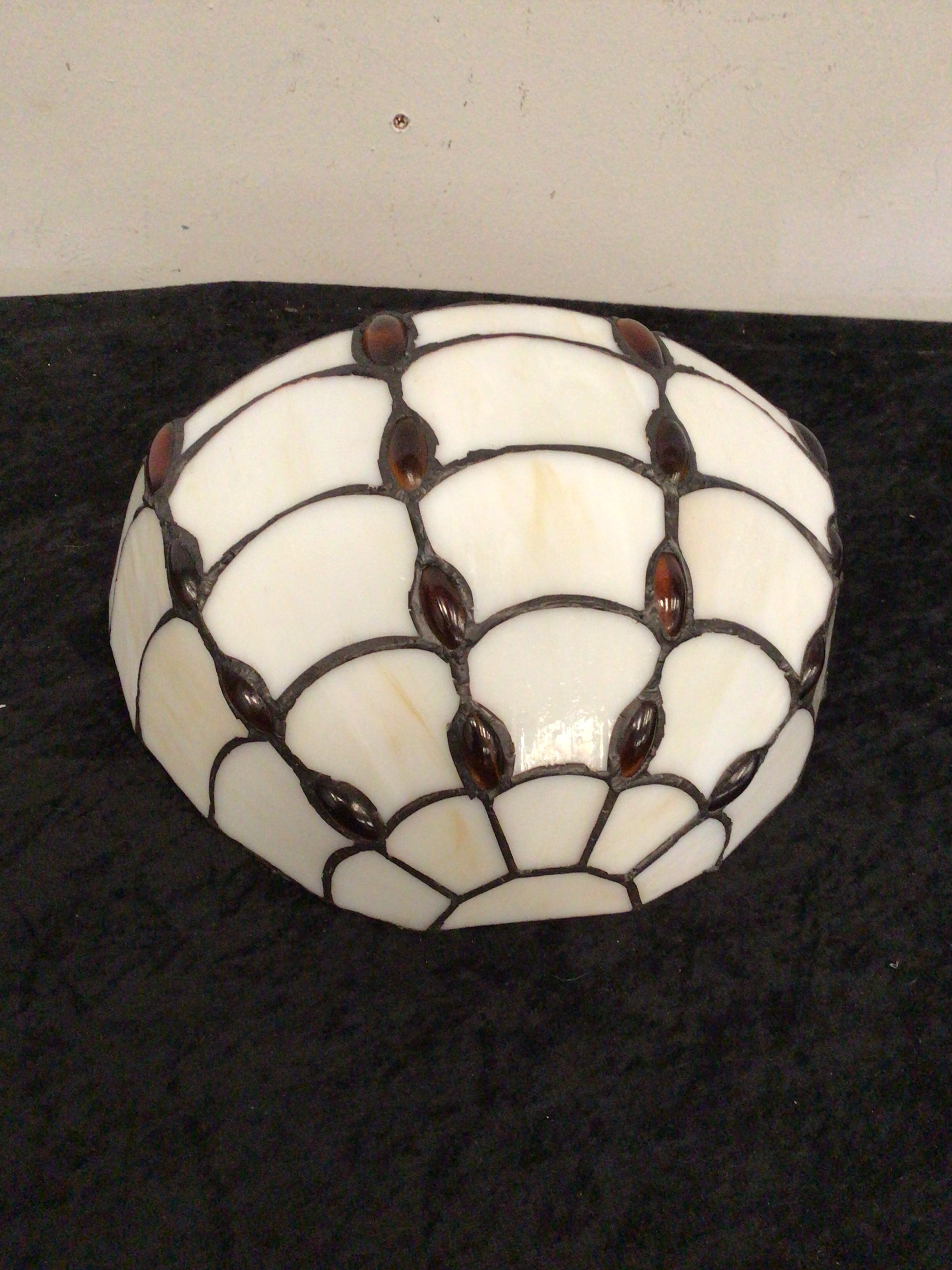 A contemporary Tiffany-style half-dome light fixture or wall sconce, featuring a geometric pattern composed of opaque white stained glass panels and interspersed dark brown/amber glass cabochons, all joined by dark metal leading. The reverse features modern mounting hardware, an electrical socket, and wiring. A label on the metal bracket indicates contemporary production with details: ‘QC QUANTITY: 100’, ‘QC.P.O.: 025’, ‘BATCH NO: 025 X’, and ‘L/AUTH NO: L201505694’, suggesting a production date of 2015 or later.