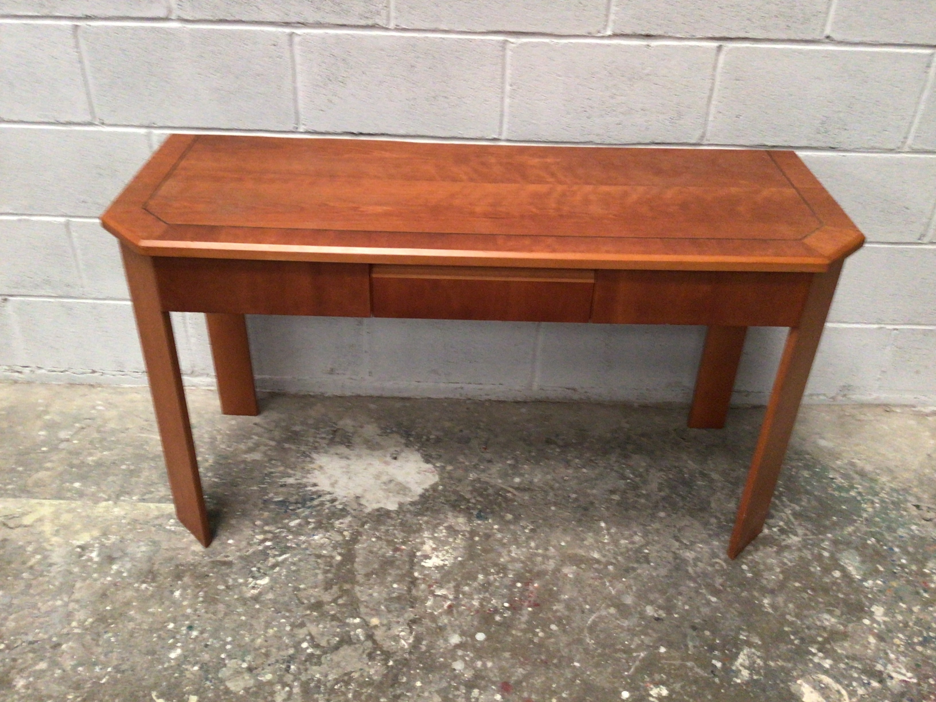 A Mid-Century Modern style wooden console table or small desk, featuring a rectangular form with subtly canted, tapered legs. The elongated top is characterized by octagonal corners and displays a simple, contrasting banding or inlay along its perimeter. Crafted from what appears to be a reddish-brown hardwood, possibly teak or cherry, the piece incorporates a single central drawer with a recessed finger-pull design, eschewing external hardware.