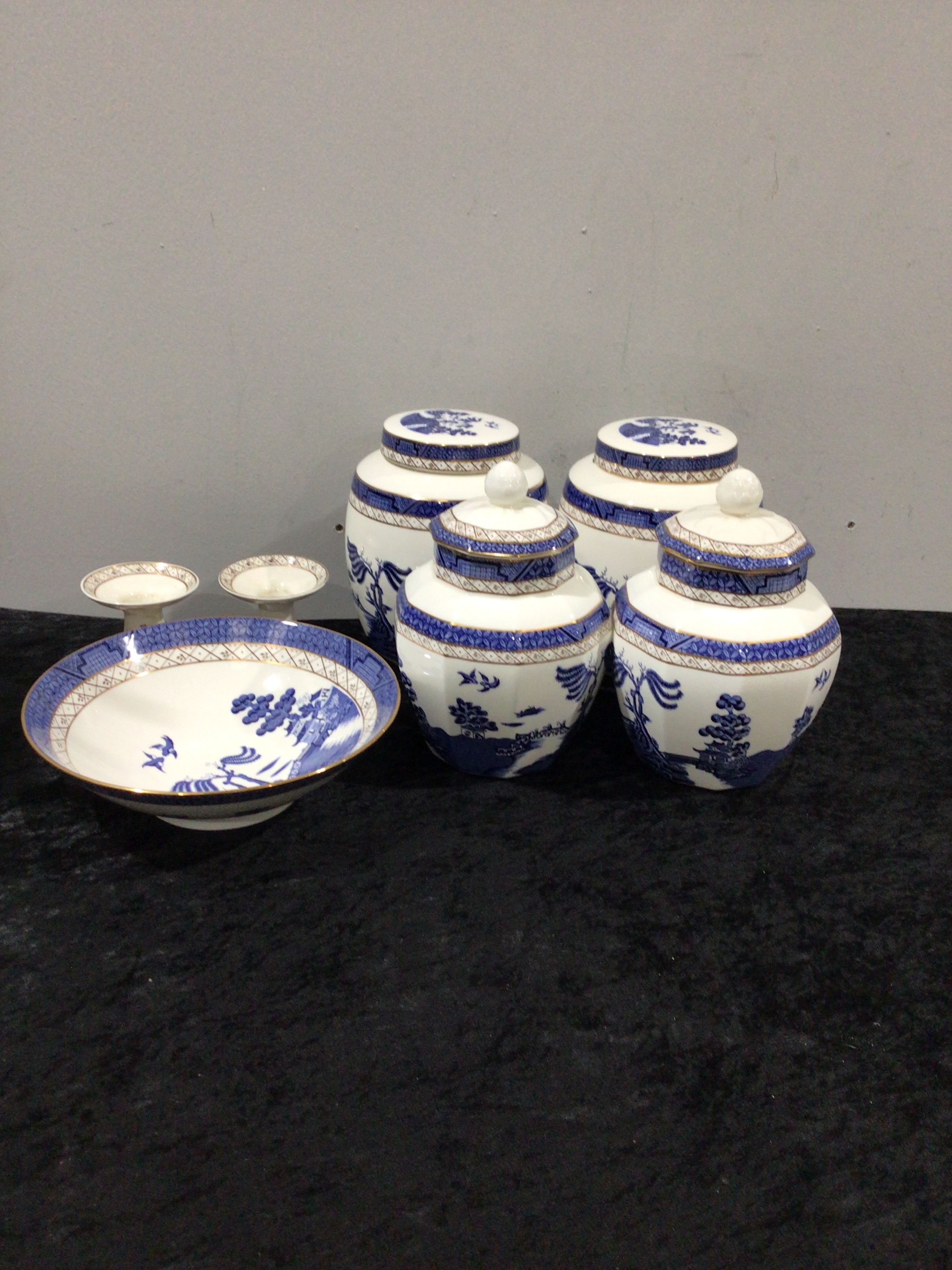 A set of six Royal Doulton Booths ‘Real Old Willow’ fine china wares, decorated with underglaze blue in a traditional “Willow Pattern” style, depicting pagodas, trees, bridges, and birds. The group includes octagonal lidded jars, a large shallow bowl, and smaller dishes. Each piece bears the manufacturer’s mark to the base: “BOOTHS ‘Real Old Willow'” fine china, “MADE IN ENGLAND” by “ROYAL DOULTON,” dated “© 1981” with pattern number “T.C. 1126.”