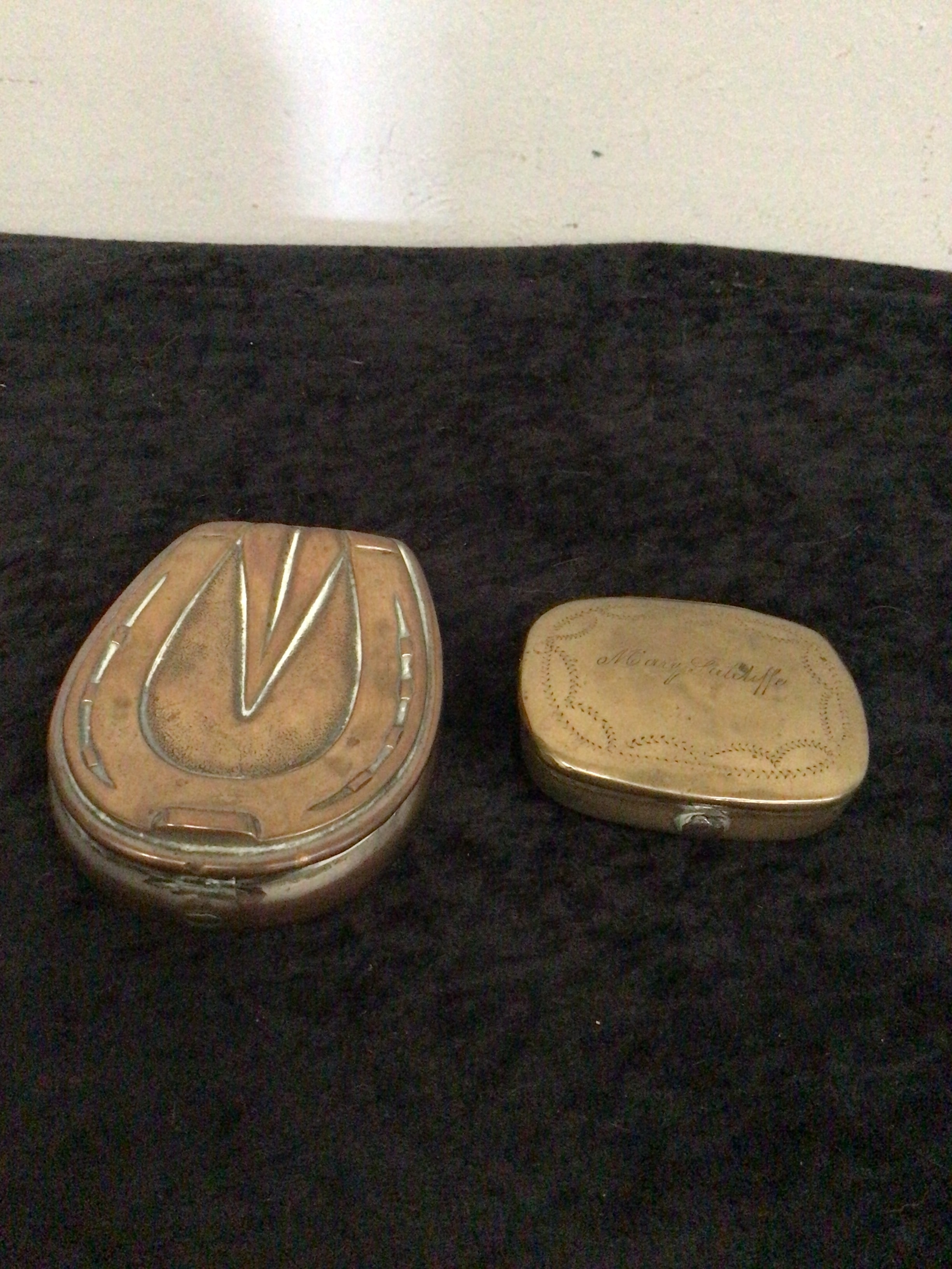 A pair of antique brass boxes. The larger box is shaped like a horse’s hoof, featuring a raised horseshoe and frog design on its hinged lid, consistent with an antique snuff box. The smaller, oval-shaped box has an engraved script on its hinged lid, possibly reading “A. Mary Radcliffe” or “A. Marg. Radcliffe,” encircled by a dotted border. Both boxes are crafted from metal, likely brass or bronze, and exhibit front clasps. Their interiors show similar patination.