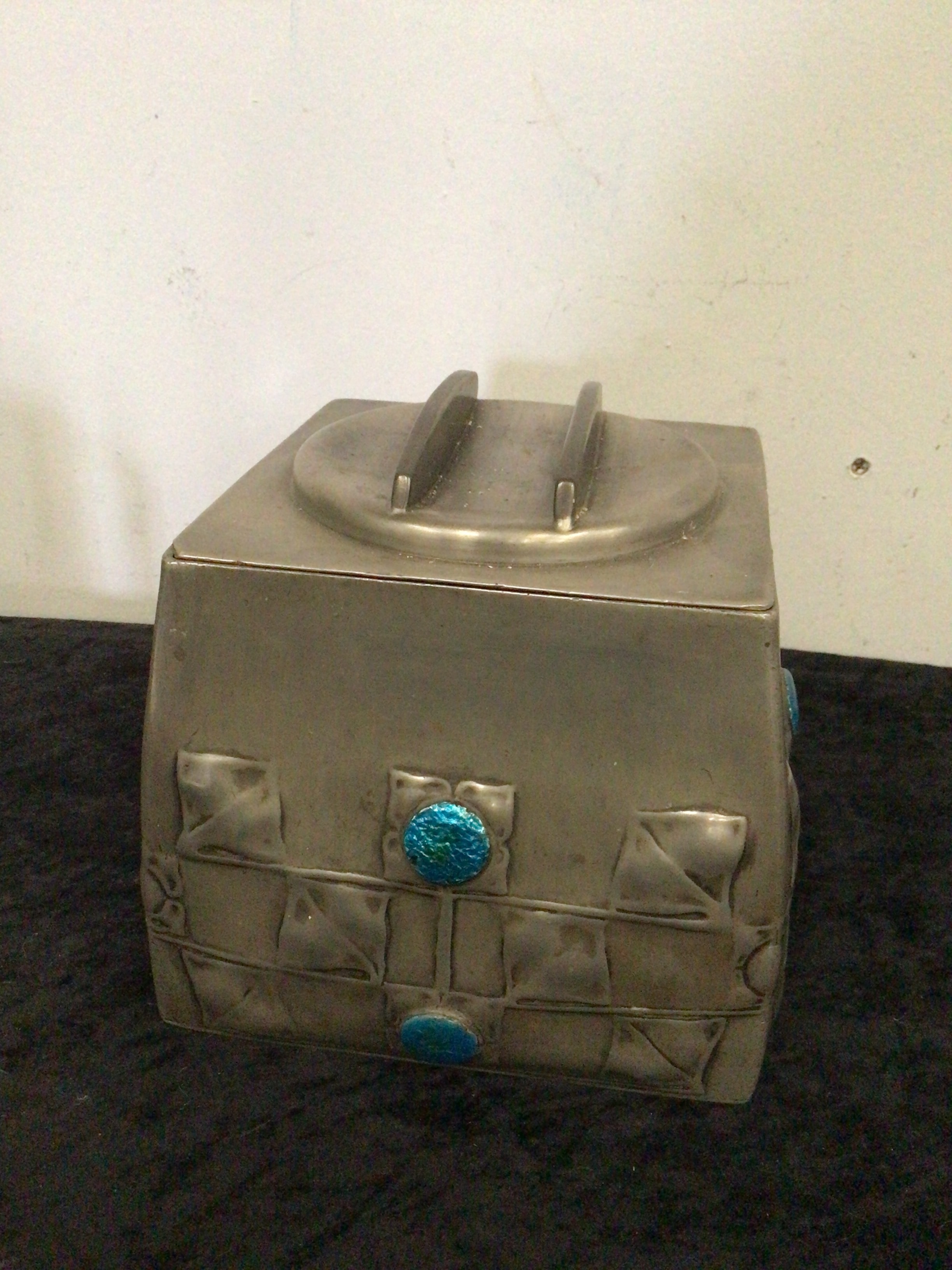 An Archibald Knox for Liberty & Co. Tudric pewter and enamel lidded box, model 0194. Constructed from a silver-toned pewter alloy with a matte finish, the rectangular form features curved lower sides. The body is decorated with embossed geometric patterns resembling padded squares, accented by three vibrant blue-green textured glass or enamel cabochon inserts on the front. The removable flat lid is centered with a raised circular element and two parallel bar-shaped handles. The design is characteristic of the Arts and Crafts or Art Nouveau period. The base is clearly stamped ‘TUDRIC’ above the number ‘0194’.
