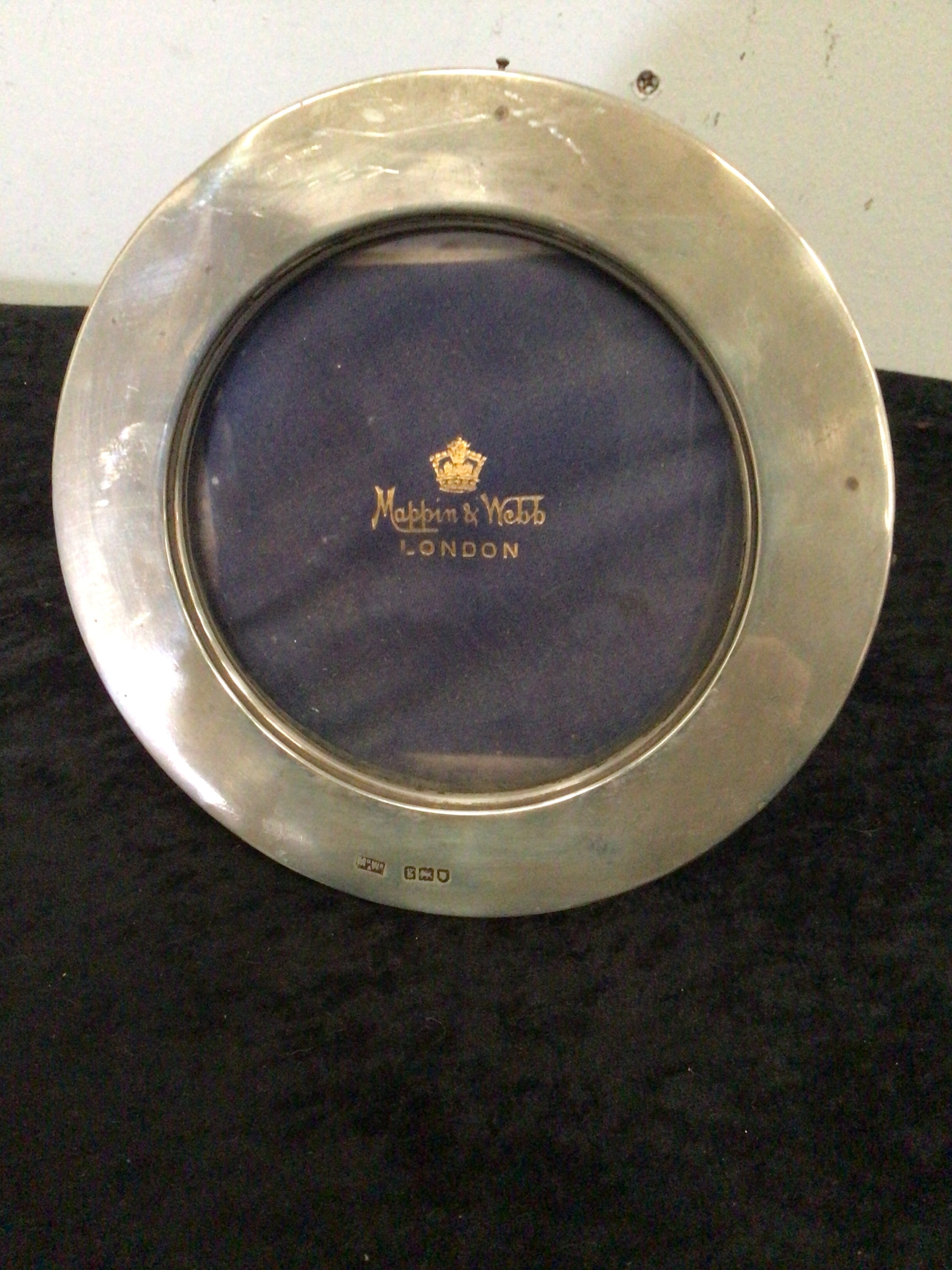 A Sterling Silver Round Picture Frame by Mappin & Webb. Constructed from silver, featuring a polished, slightly convex profile in a plain, classical style. The central opening currently displays a dark blue fabric insert embroidered in gold with a crown logo above ‘Mappin & Webb’ and ‘LONDON’ below. Visible hallmarks on the lower rim include a rectangular punch with ‘M:W’ (maker’s mark), a lion passant (standard mark indicating sterling silver), followed by further indistinct marks including a lowercase ‘o’ within a square punch (likely a date letter), and additional characters resembling ‘GMO’.