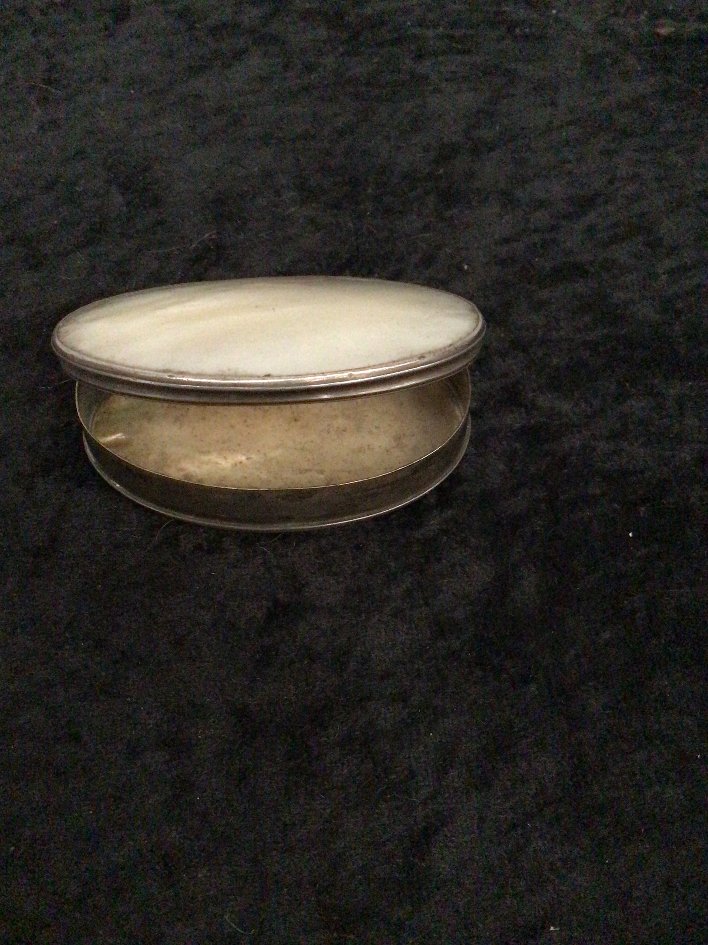 An oval-shaped hinged patch box, crafted from a silver-toned metal, with the lid featuring an iridescent white mother-of-pearl inlay. The mother-of-pearl exhibits natural striations. The interior of the box is of the same metal. No visible text or markings are discernible.