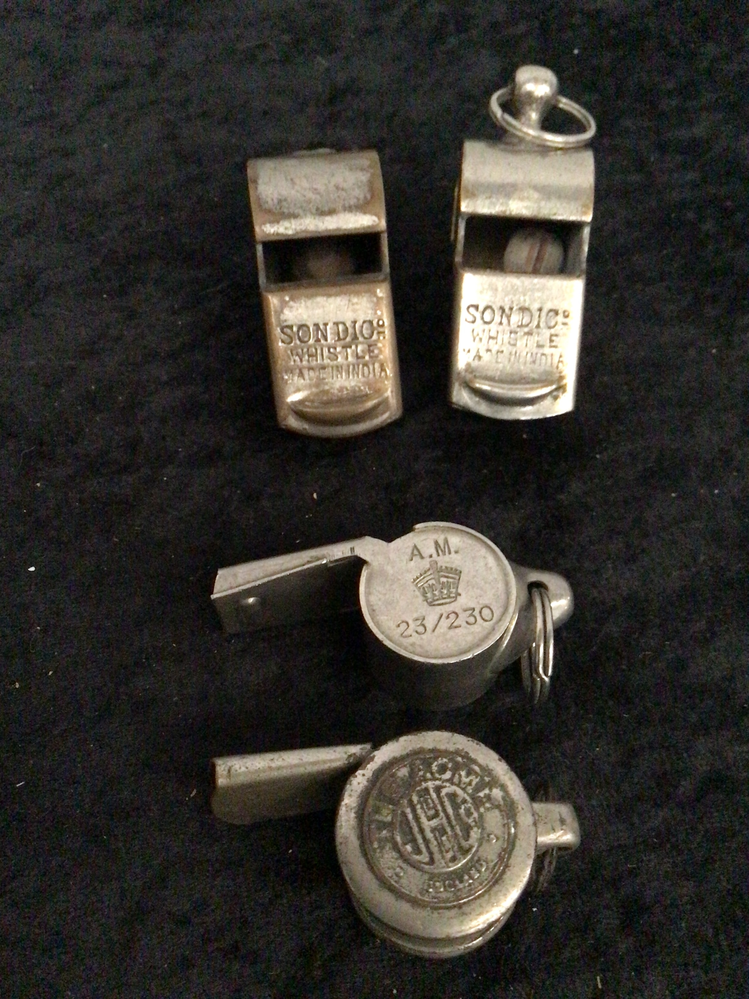 A WW2 RAF Ditching Whistle, of cylindrical design and likely nickel-plated, stamped ‘A.M.’ with a debossed crown motif and numbered ’23/230′. Accompanying this are three other whistles: two open-top, box-style pea whistles, each marked ‘SONDIC WHISTLE MADE IN INDIA’; and one cylindrical whistle bearing the ‘ACME’ brand name within a circular mark, possibly incorporating a ‘TH’ monogram, and clearly marked ‘ENGLAND’. All items are metallic, likely nickel-plated.