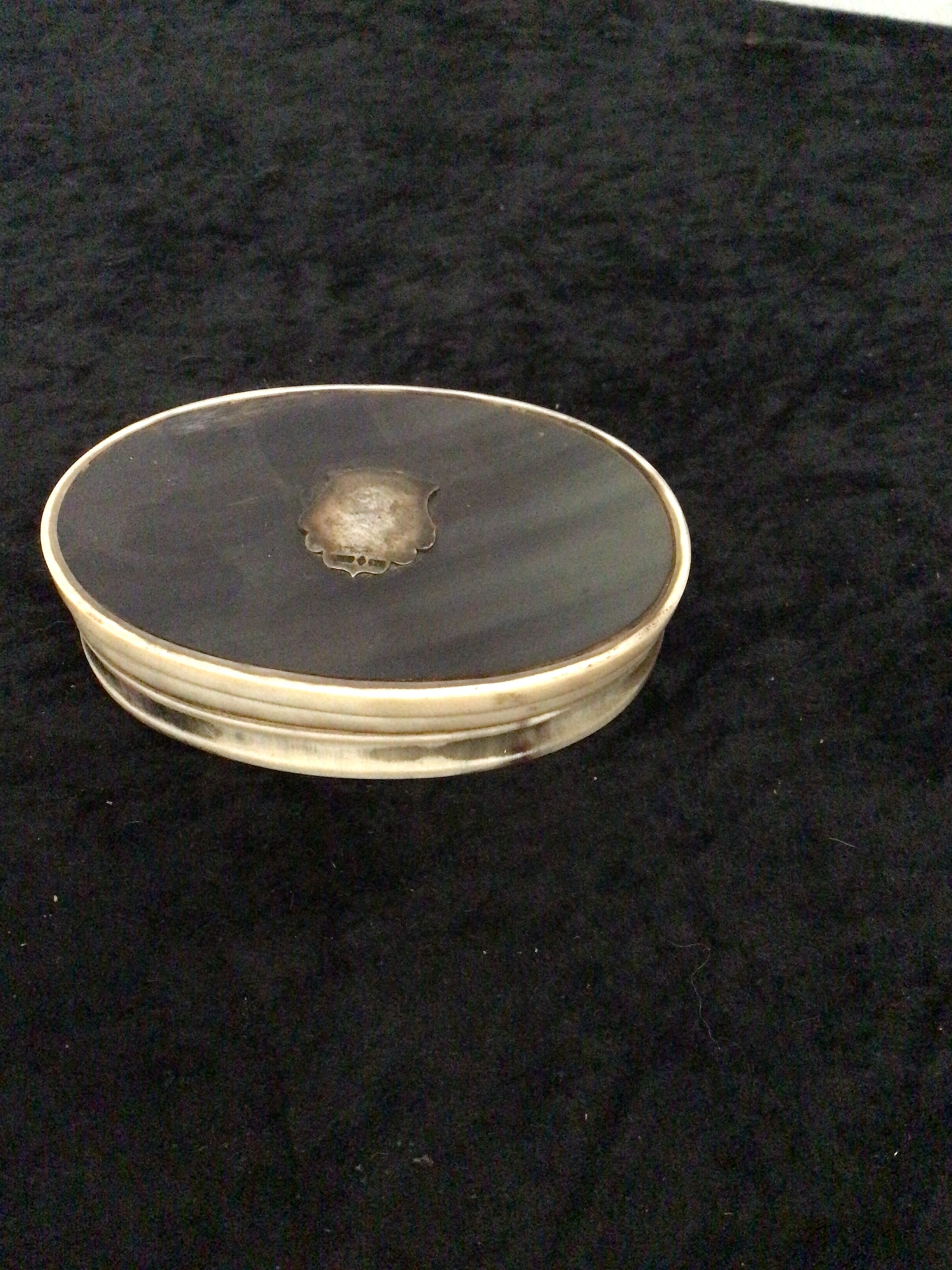 An early 19th century oval snuff box. The base and sides are crafted from a creamy-white material, consistent with bone. The removable lid is made of a dark, translucent material resembling horn. Set into the lid is a shield-shaped metallic escutcheon, likely silver, which bears small, indistinct hallmarks or maker’s marks at its lower edge.