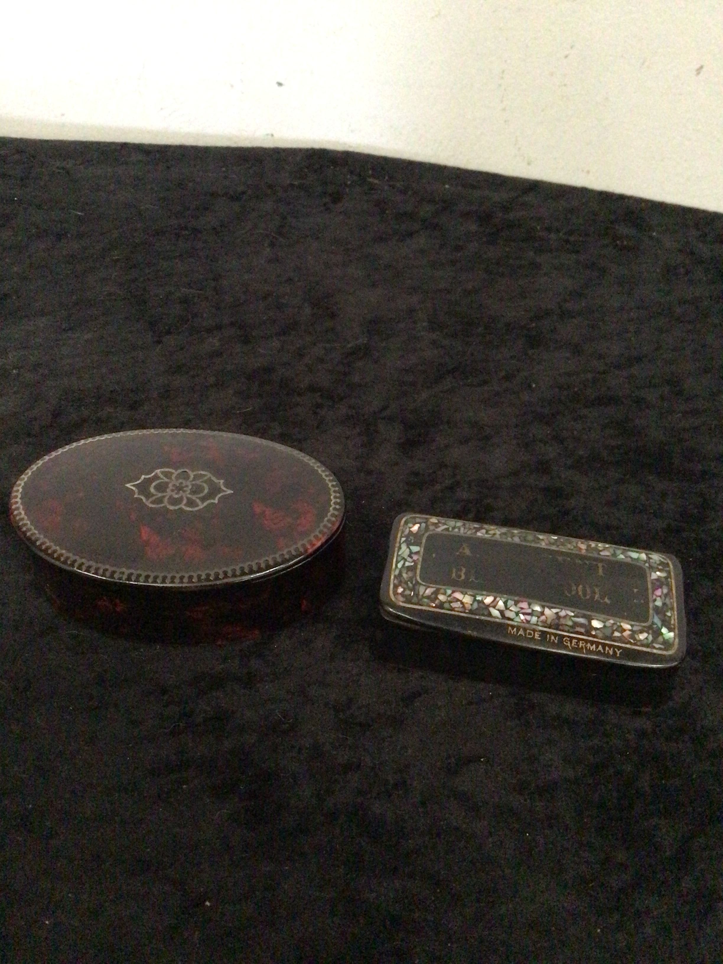 A pair of vintage lidded boxes. The first is an oval, dark reddish-brown box, featuring a silver-coloured ornate floral or foliate inlay on its lid and a decorative serrated edge, with a black interior. The second is a rectangular dark metal box, possibly tin, with a lid intricately decorated with mother-of-pearl or abalone inlay in a geometric pattern. This rectangular box’s lid also displays the text “A B A S O L” within its central panel and “MADE IN GERMANY” along its lower edge. Both boxes exhibit dark interiors.