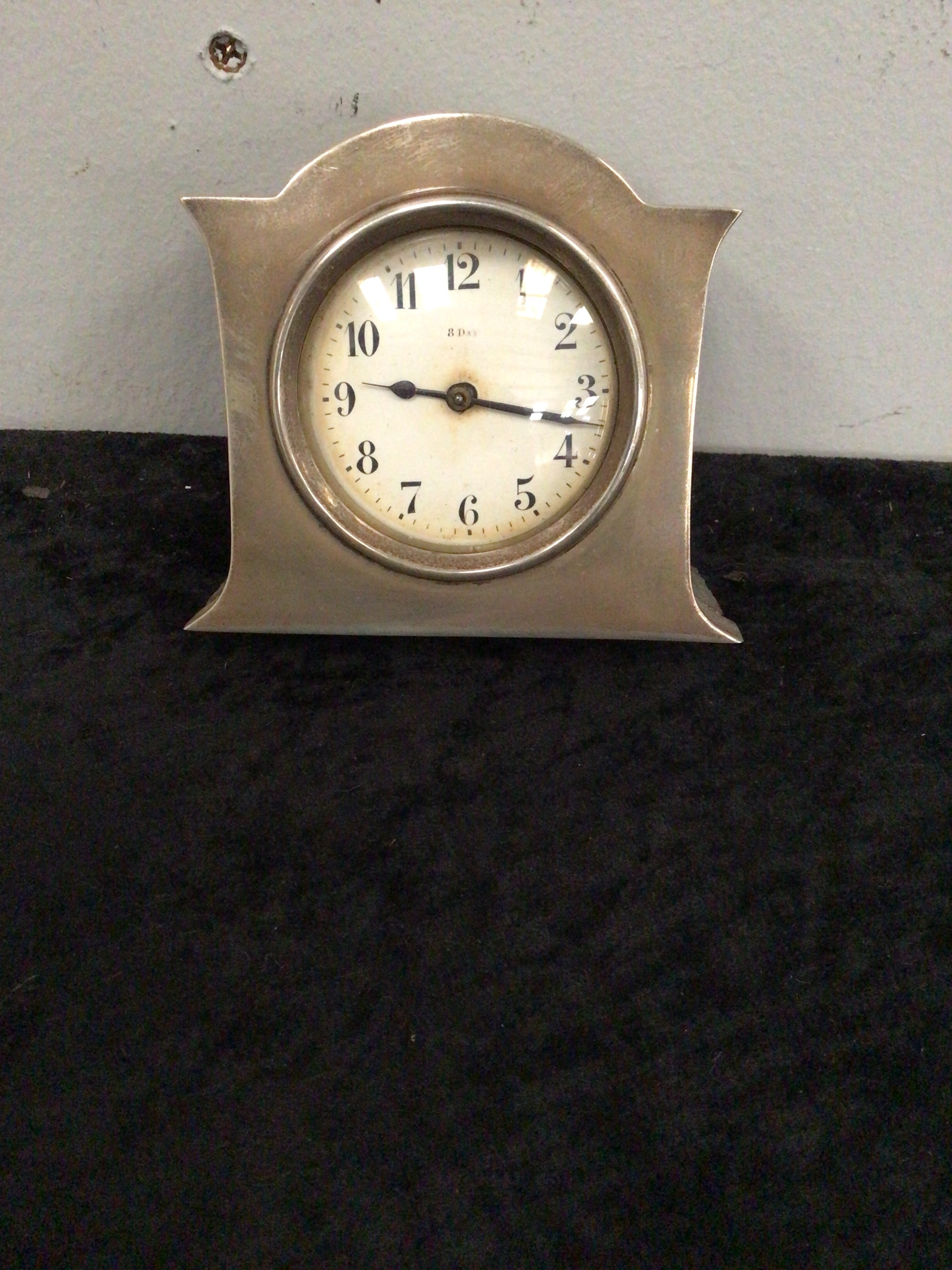 A British sterling silver and leather-cased 8-day travel clock, bearing British hallmarks for Birmingham, date letter ‘o’, and maker’s mark ‘B & S’. The clock features an arched-top rectangular sterling silver casing, enclosing a white dial with black Arabic numerals. The dial is prominently marked ‘8 Days’ below the 12 o’clock position. The reverse of the clock is covered in a dark, textured material, likely wood or leather-clad wood.