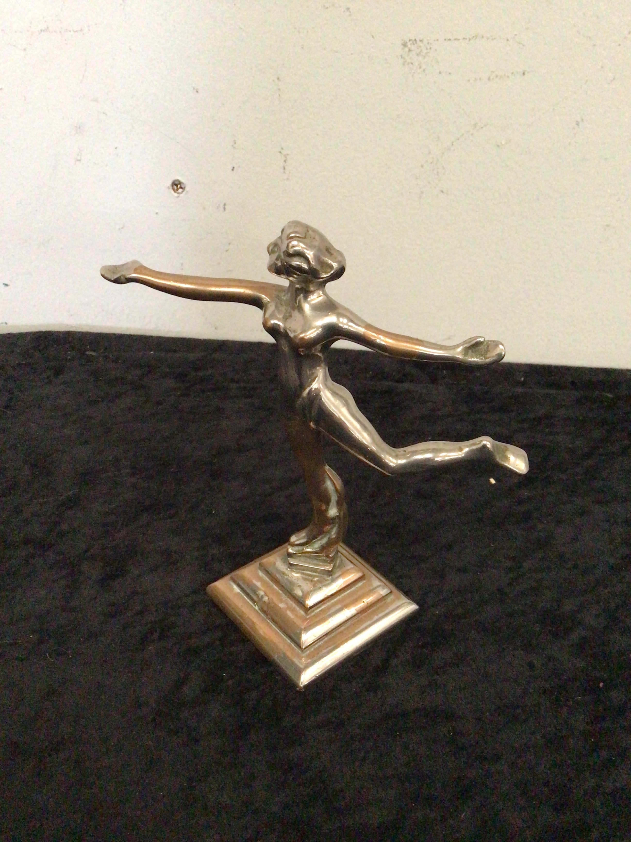A 1920s 1930s Art Deco Speed Nymph Goddess Hood Ornament Mascot. This figural statuette depicts a dynamic female figure, possibly a dancer or sprite, balanced on one leg with arms extended, characteristic of the Art Deco period. It is crafted from a metallic alloy, likely brass or bronze, which exhibits areas of worn brighter plating (possibly chrome or nickel) revealing the warmer base metal beneath, suggesting a dual-tone finish or significant surface wear over time. The figure is mounted on a stepped, square metallic base. No discernible manufacturer’s marks or textual inscriptions are visible on the figure or its base.