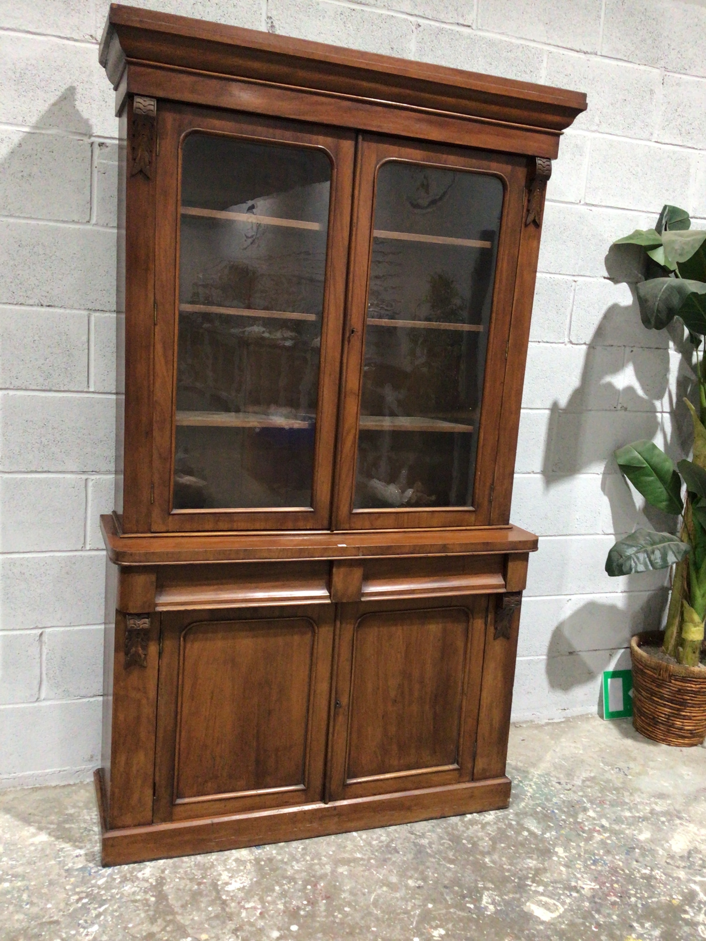 A Victorian mahogany bookcase display cabinet, constructed in two parts from a reddish-brown hardwood. The upper section features two framed glass doors with rounded upper corners, enclosing multiple interior shelves. The lower section consists of two solid wood paneled doors. Architectural details include a prominent molded cornice, and classical-inspired carved leaf motifs adorn the stiles below the cornice and flanking the central divide between the upper and lower sections. Keyholes are visible on all four doors. The cabinet rests on a sturdy plinth base. No visible text or markings are discernible.