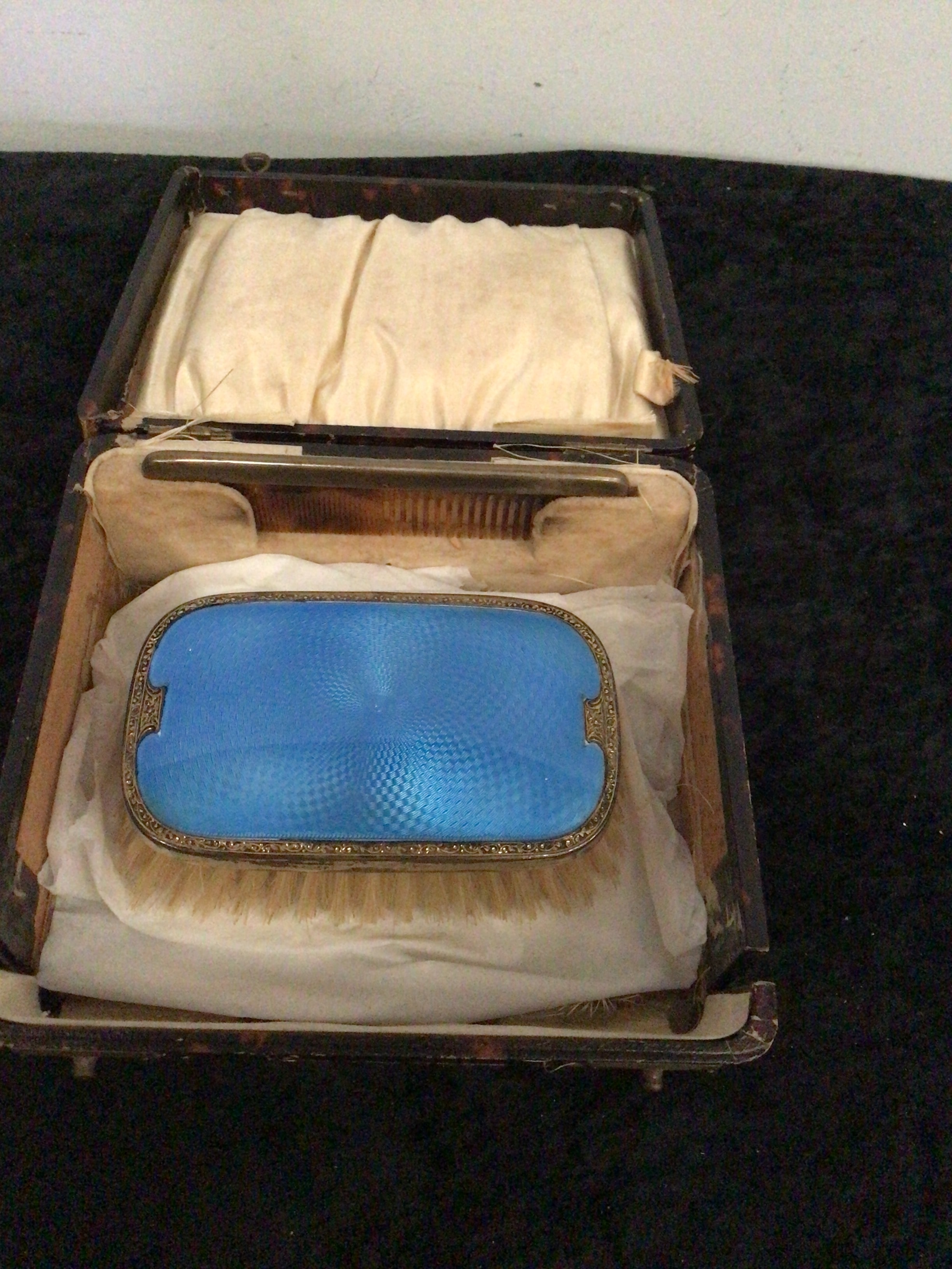 A cased silver and enamel brush and comb set. The primary brush features an oval sterling silver and gilt frame, extensively decorated, and topped with a vibrant blue guilloché enamel panel displaying a concentric circular pattern. Visible hallmarks on the metal include a lion passant (sterling silver standard mark), a crowned leopard’s head (London assay office mark), and a date letter ‘b’, alongside a maker’s mark. The set includes a complementary comb. It is housed in a rectangular hinged box covered in a dark brown faux tortoiseshell material with decorative scalloped trim. The fitted interior is lined with cream-colored fabric.