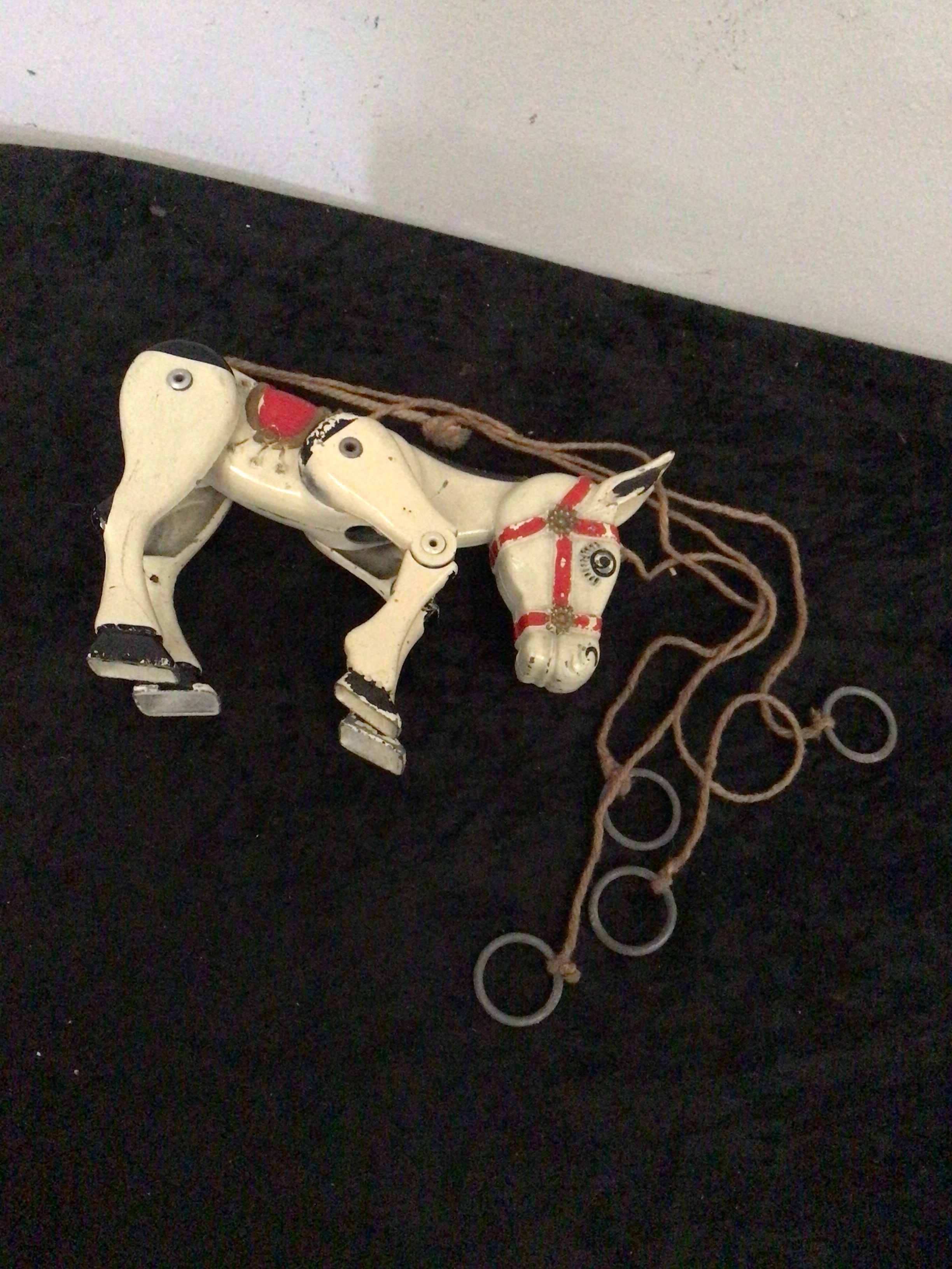 A vintage articulated pull-toy, identified in market intelligence as ‘Muffin The Mule’. The item’s materials are confirmed to be Metal. Executed in a folk-art style, likely dating from the early to mid-20th century, it features articulated legs with small metal wheels or skids on the hooves, secured by metal rivets that also form the eyes. Decorative elements include a red fabric saddle and bridle straps, complemented by a natural fiber cord attached to four small metal control rings.