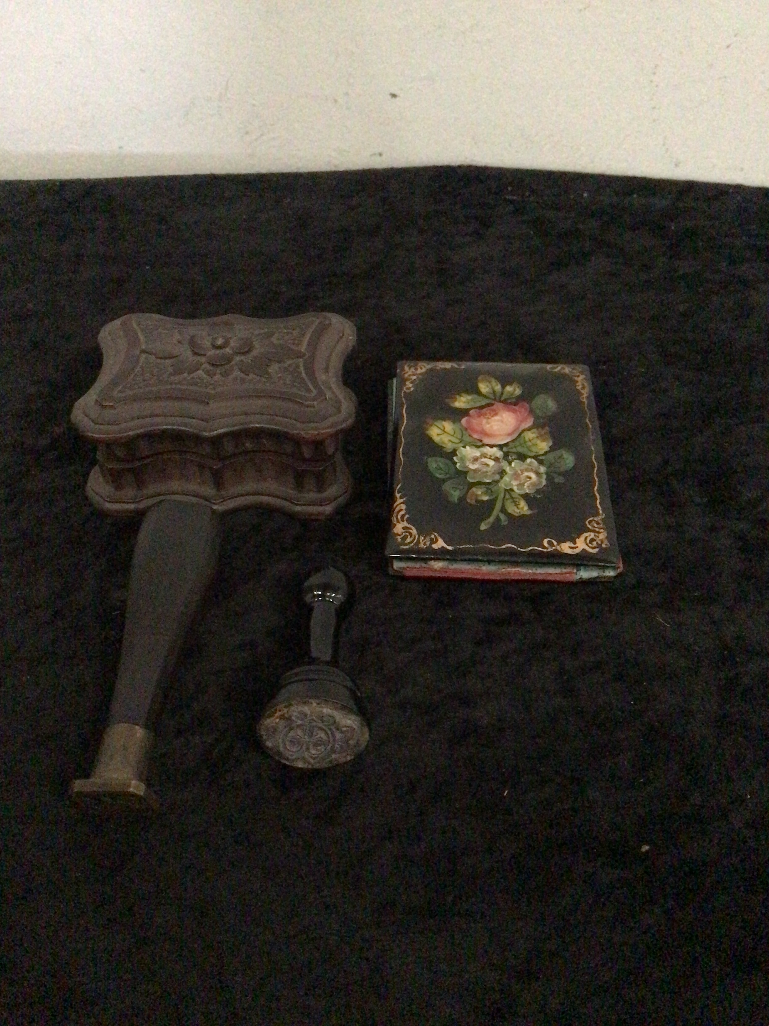 A group of three Victorian Black Forest carved wood desk accessories. The collection includes a dark-stained wooden rocker blotter, featuring a carved floral motif on its domed top and a brass-toned handle base. It opens to reveal a compartment. Also present is a small decorative book, possibly a diary or address book, with a dark cover embellished with a hand-painted or transfer-printed floral bouquet (roses) and gold tooling. It opens to reveal plain or lightly lined pages and blue patterned endpapers. Completing the group is a brass or bronze wax seal, with an ornate handle and a circular base bearing an intricate, unidentifiable embossed design. All pieces display visible wear consistent with age and use.