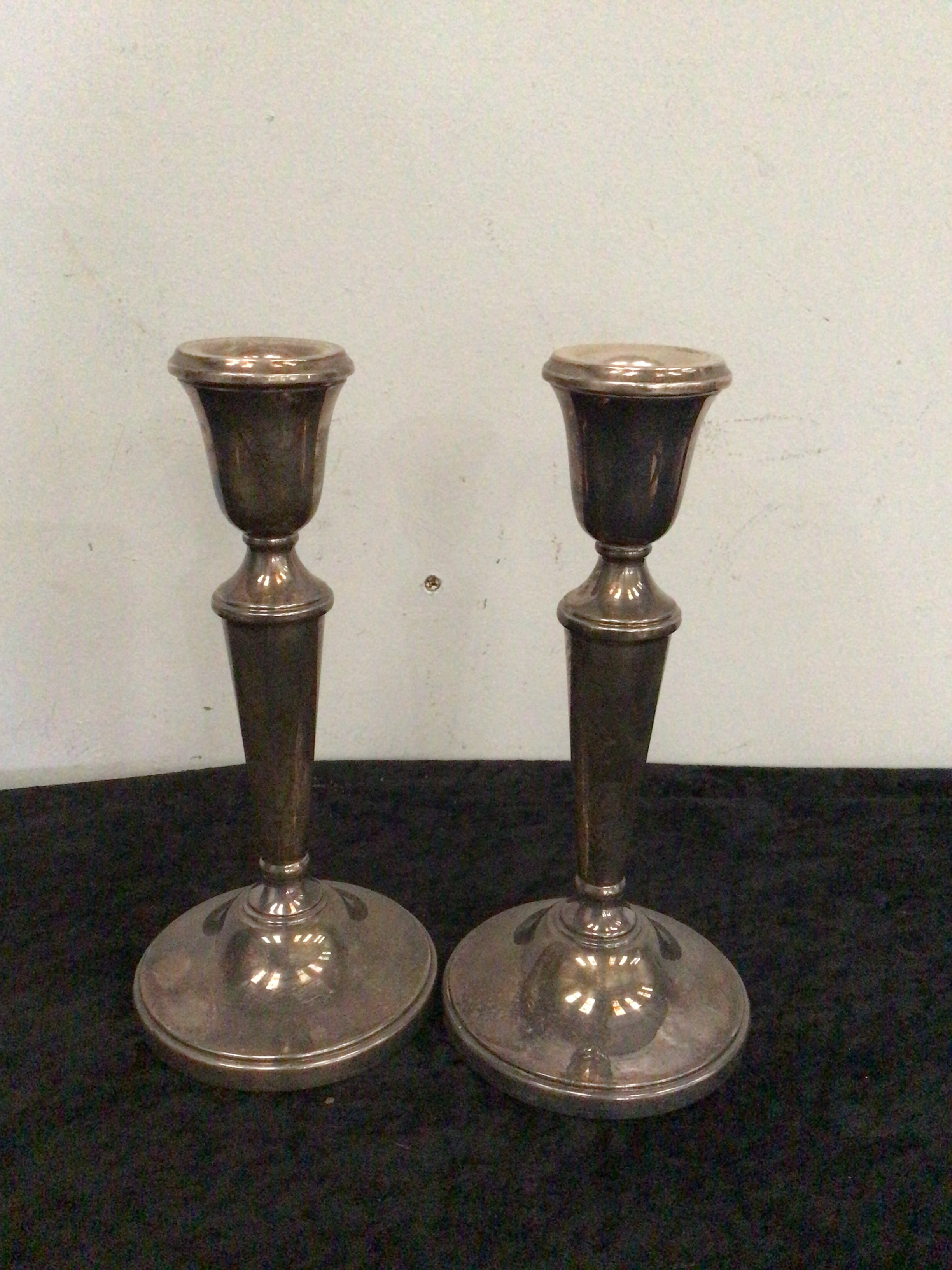 A pair of Empire weighted sterling silver candlesticks. Each candlestick features a stepped circular base, a tapering reeded or plain columnar stem, and a simple cup-shaped bobeche. Visible markings on the underside of one base include ‘MA &’ (possibly ‘MA & Co.’) and ‘STERLING’ or a fineness mark, alongside other minor illegible stamps.
