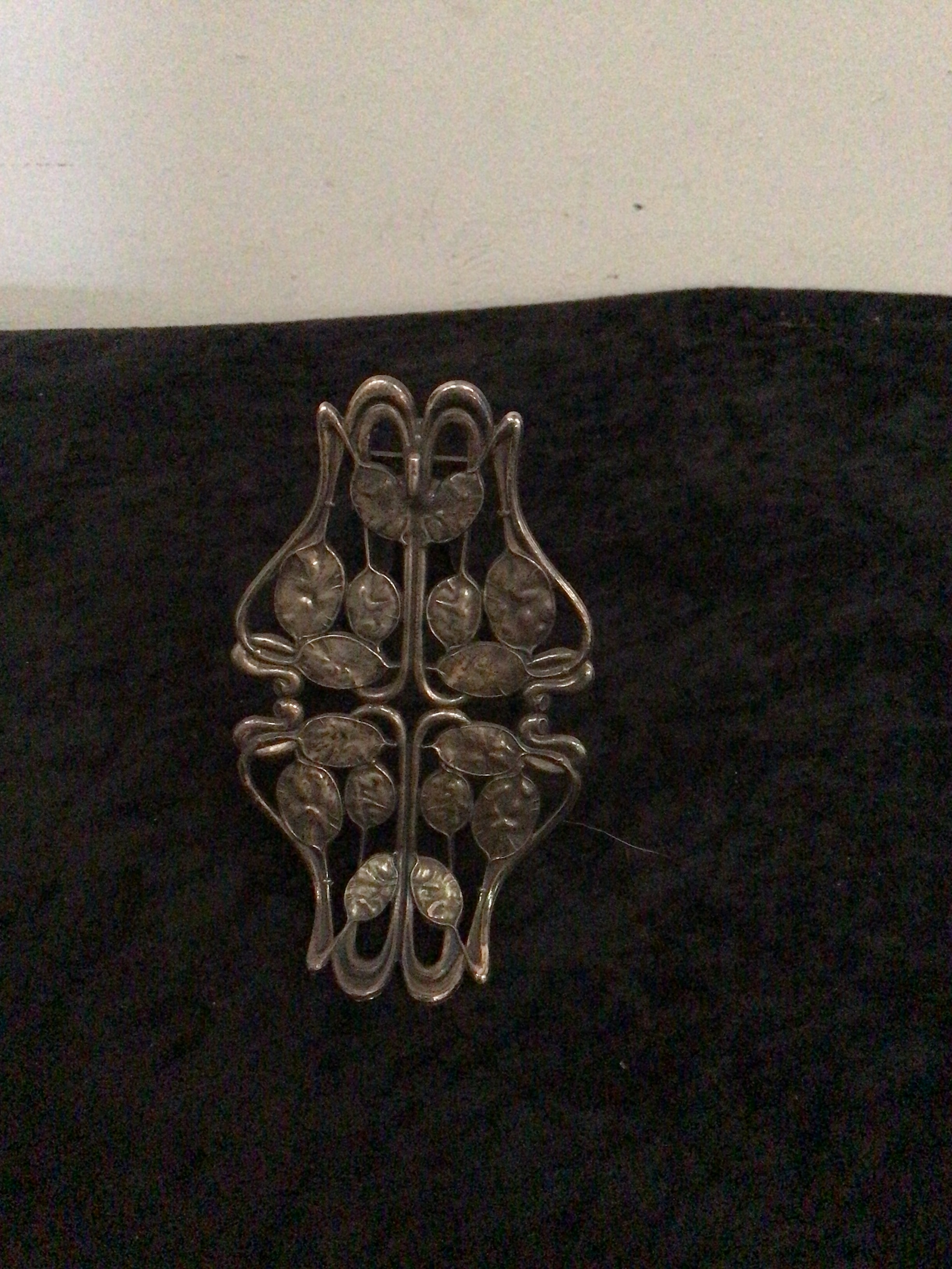 An antique sterling silver pocket watch holder designed with a symmetrical openwork form. The design features flowing curvilinear lines and abstract botanical motifs, including stylized leaves and circular elements, characteristic of the Art Nouveau or Arts & Crafts period. The reverse is fitted with a functional hinged pin mechanism and is clearly stamped with the ‘STERLING’ hallmark.