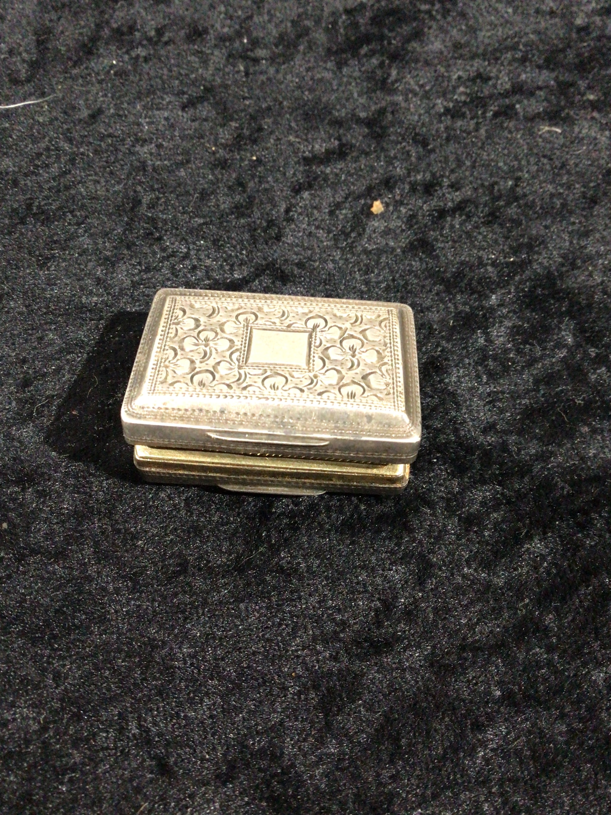 This is a small, rectangular hinged box, identified through market comparison as a Georgian Sterling Silver Vinaigrette Box, likely originating from Birmingham. The exterior is crafted from a silver-toned metal, featuring an engraved or chased decorative pattern on the lid with a central blank cartouche surrounded by scrolling foliate and floral motifs. The interior reveals a gold-toned metal, consistent with gilding, with the inside of the lid bearing faint, incised or stamped markings that appear to include a numeral followed by letters, which are indistinct. The lower section of the box contains a removable or hinged insert, also of gold-toned metal, intricately pierced with a detailed openwork design of floral and foliate elements.