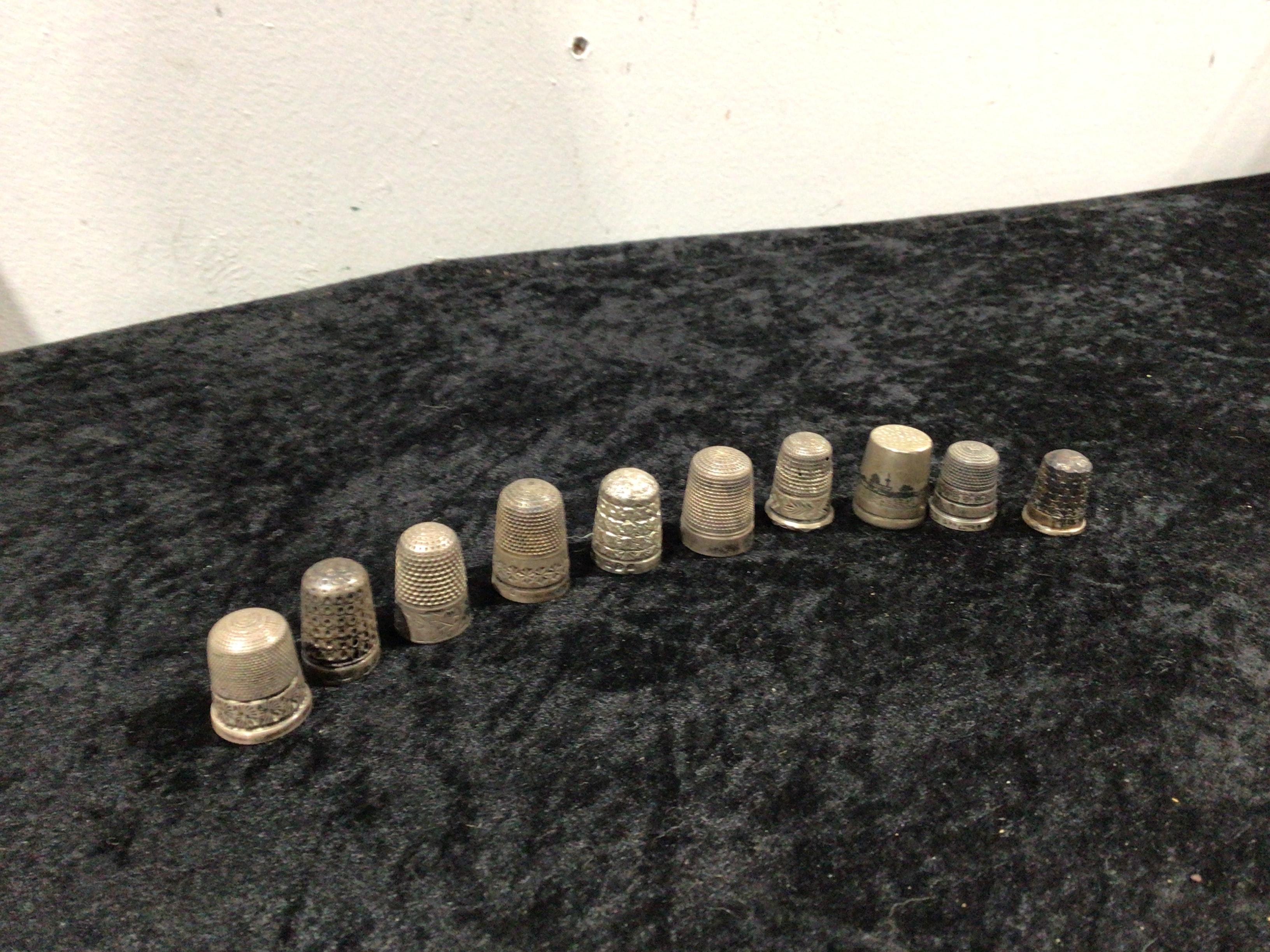 A collection of ten sterling silver thimbles, comprising assorted designs. Styles range from functional dimpled surfaces to decorative examples featuring ornate bands, floral or foliate motifs. One notable thimble is engraved with a cityscape scene. The thimbles exhibit varying levels of tarnish and signs of age and use, consistent with antique or vintage metal objects.