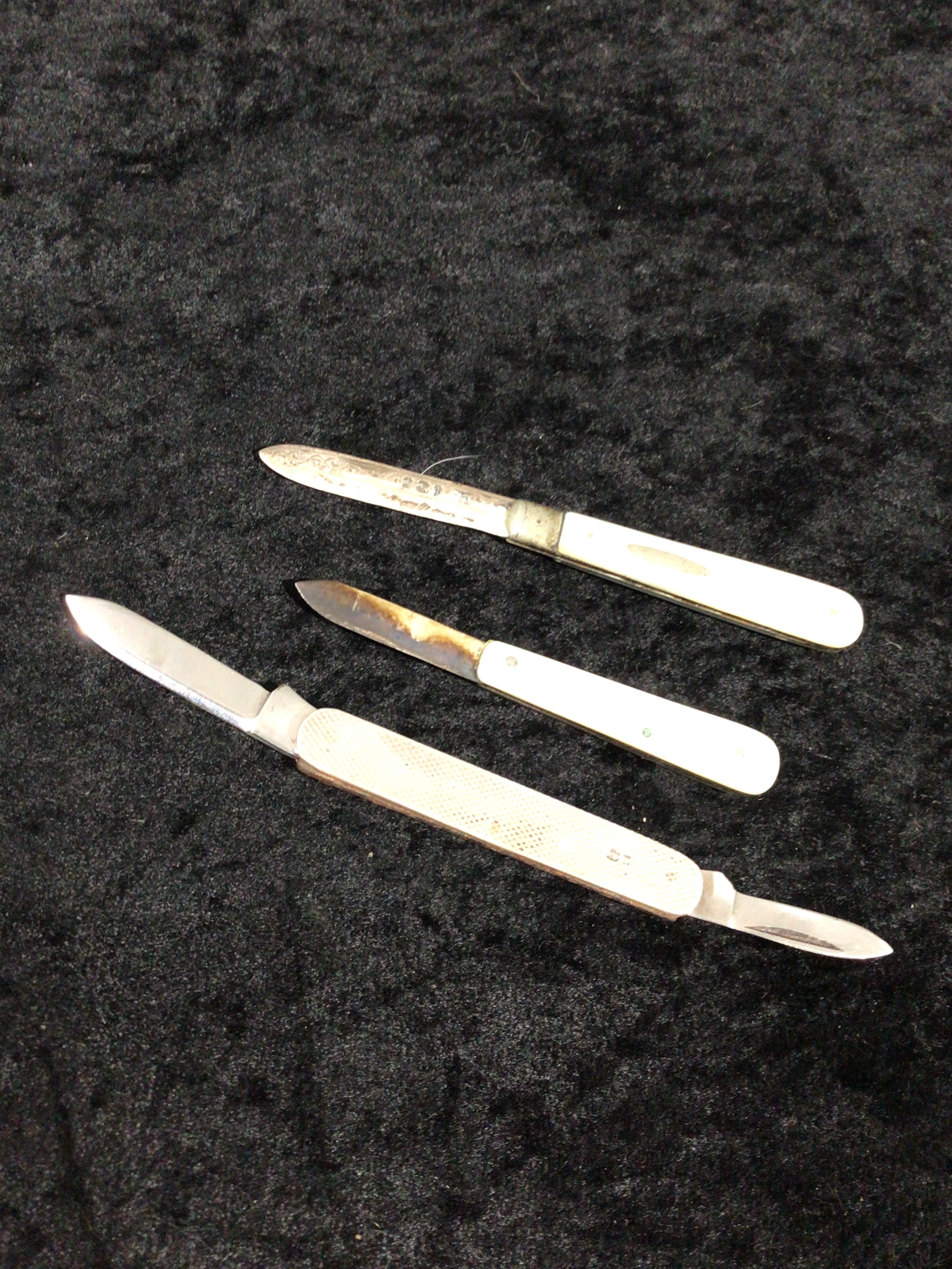 This lot comprises three silver vintage or antique folding knives, likely pen or fruit knives. Each knife features silver blades and off-white handle scales, most probably mother-of-pearl or a similar composite material. The topmost knife is a single-blade model with faint scrollwork engraving on the blade and a partially discernible mark near the bolster, featuring smooth handle scales. The middle knife also has a single blade and smooth handle scales. The bottom knife is a two-blade model, distinguishable by its finely textured or cross-hatched handle scales. The metal bolsters and pins are present.