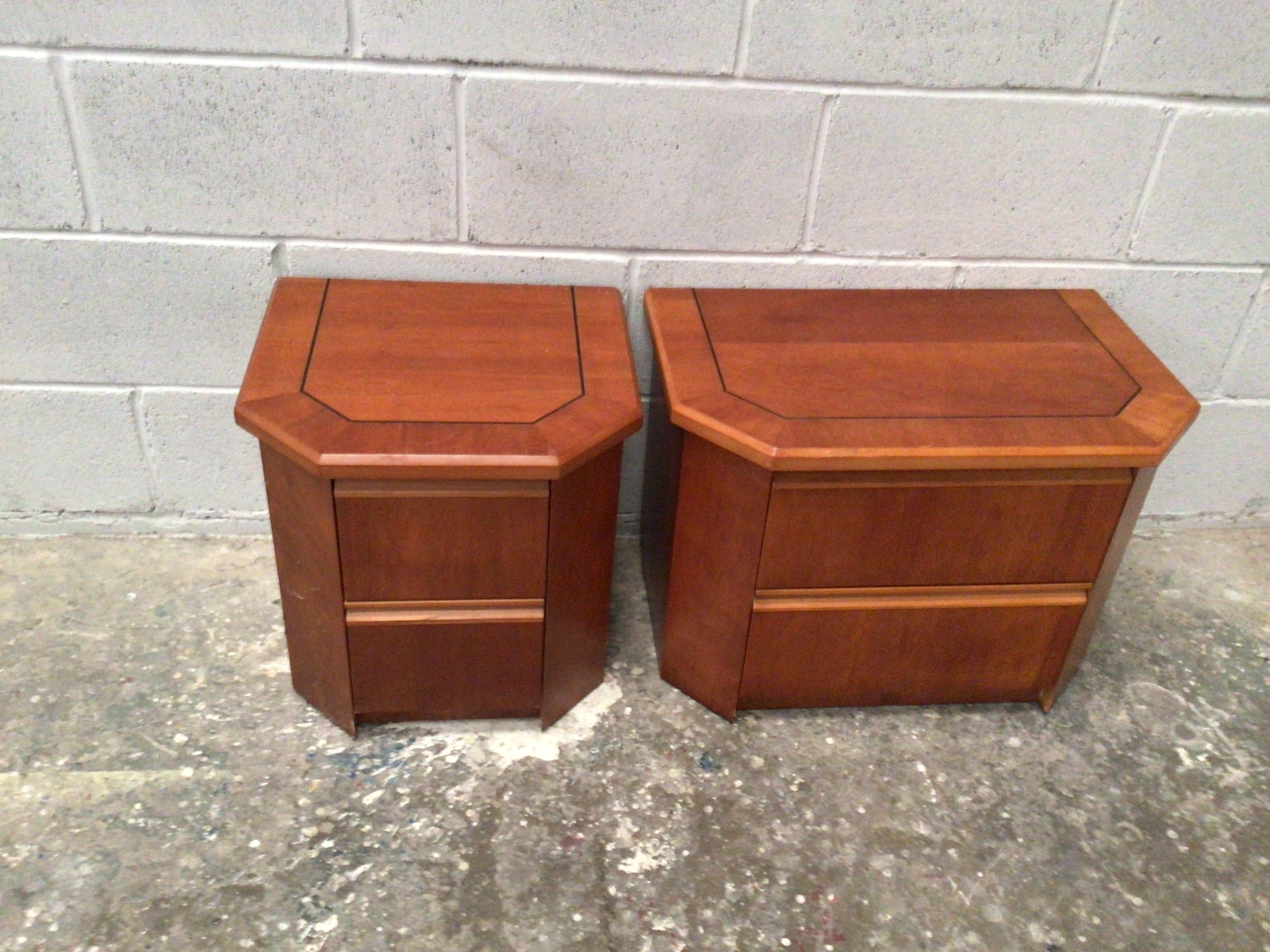 A pair of wooden bedside tables or nightstands, each featuring a reddish-brown finish, likely cherry or a similar wood or veneer, with visible grain. Both units are designed with an octagonal or chamfered top accented by a darker inlaid line. The table on the left presents with one visible drawer, while the table on the right features two drawers. All drawers are handleless with integrated pulls. Stylistically, these tables exhibit a modern or late 20th-century aesthetic, consistent with the Mid-Century Modern or Postmodern period. No visible manufacturer labels or markings are discernable.
