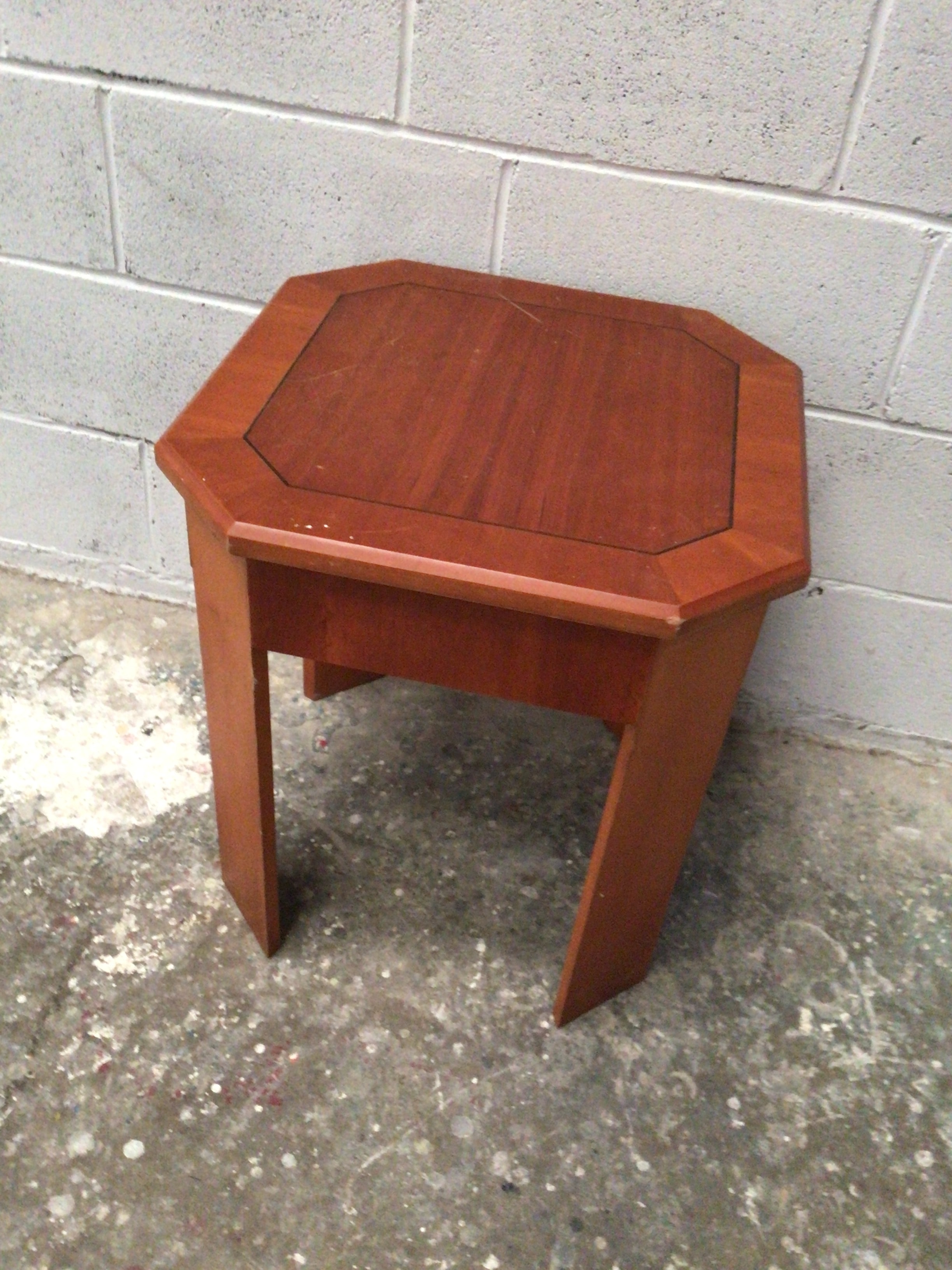 A vintage hexagonal side table, crafted from wood or wood veneer with a reddish-brown finish. The design features a central panel on the top surface bordered by a darker inlay and stands on straight, unadorned legs. The form suggests an Art Deco or Mid-20th Century aesthetic.