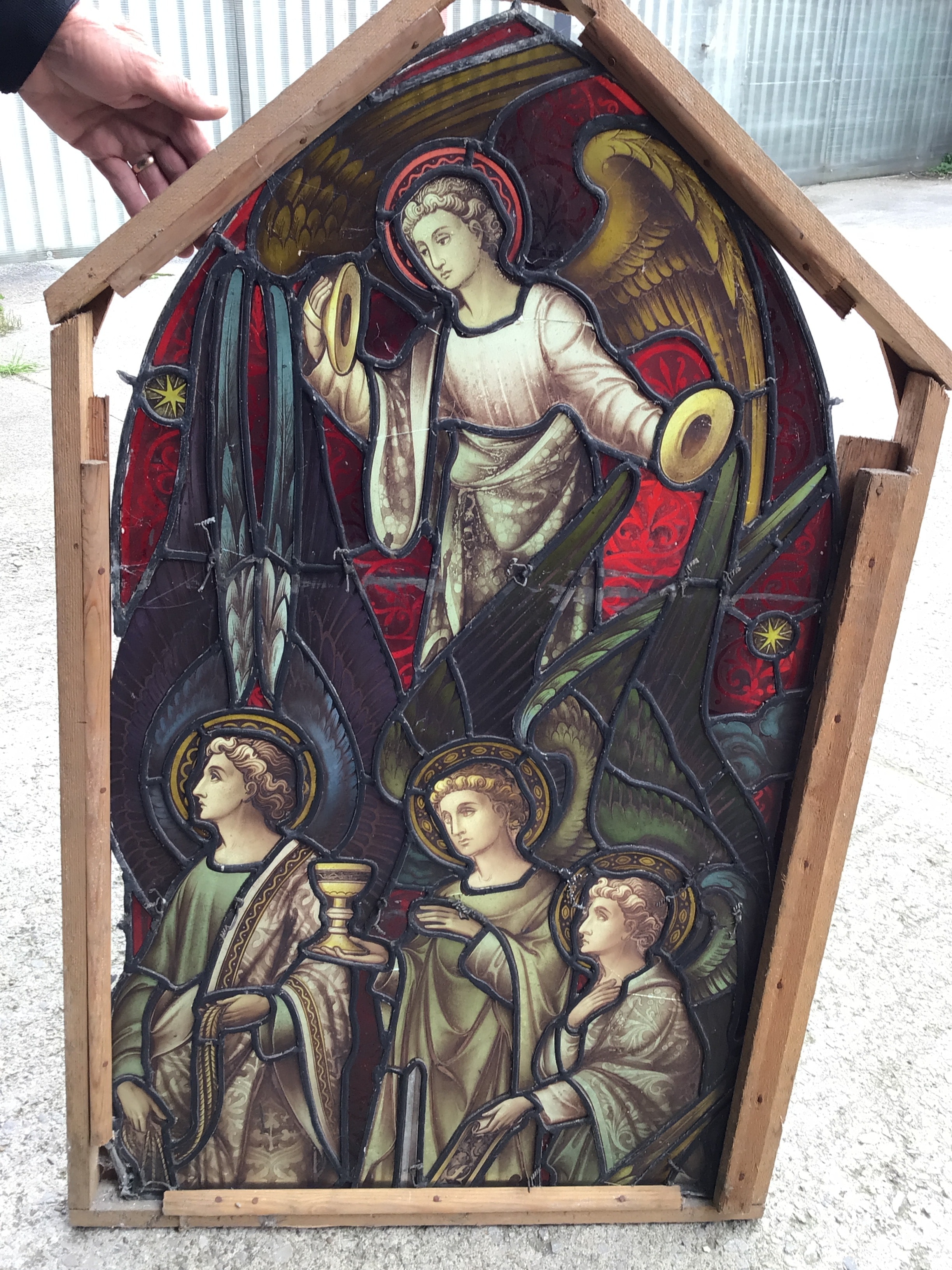 A pair of 19th Century ecclesiastical stained glass panels  Each panel is set within a simple, unpainted wooden frame. The first panel depicts a large central angel playing cymbals, positioned above three smaller haloed figures, one of whom holds a chalice, against a vibrant background of red and blue. The second panel features multiple haloed figures, some holding swords or cruciform objects, with the prominent letters “VR” visible on a banner or scroll. Both panels display a 19th Century Gothic Revival style, utilizing multicolored glass joined by lead came. One of the wooden frames features a gable-like architectural top.