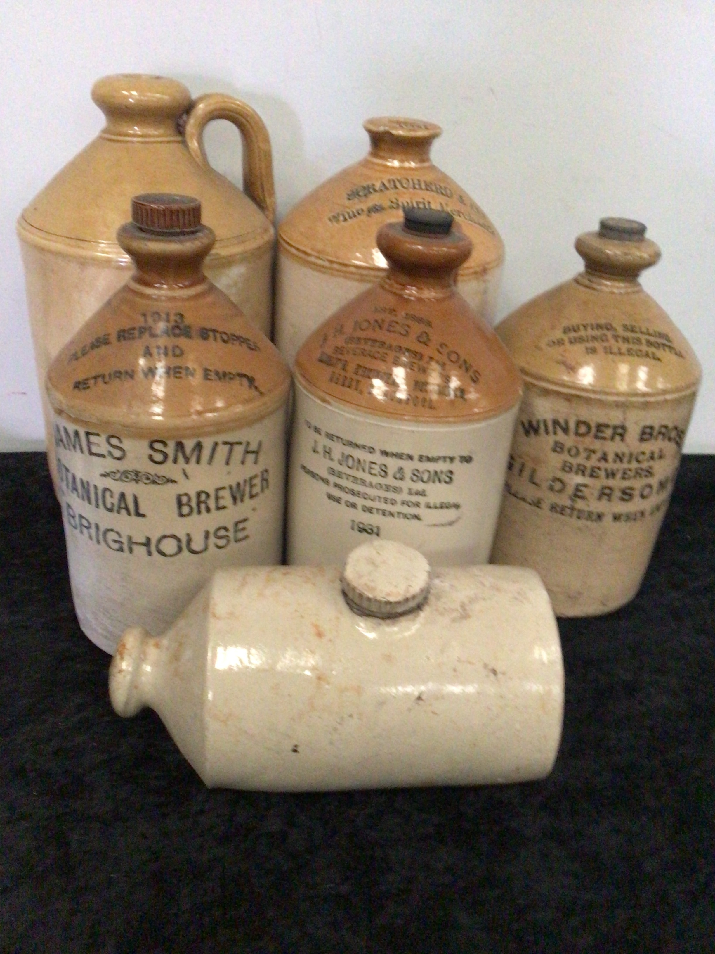 A collection of six early 20th-century salt-glazed stoneware bottles and flagons, primarily featuring a two-tone finish with dark brown upper sections and cream-to-off-white bodies. The group comprises five upright bottles, one of which includes a handle, and one bottle presented horizontally with a screw-top closure. Visible impressed and printed text on the bottles indicates their commercial origins and dates. These include a bottle marked ‘JAMES SMITH BOTANICAL BREWER BRIGHOUSE’ dated 1913, another from ‘J.H. JONES & SONS BOTANICAL BEVERAGES’ dated 1931 and bearing warnings regarding “PROSECUTED FOR ILLEGAL USE OR DETENTION,” and a bottle from ‘WINDER BROS BOTANICAL BREWERS’ with instructions stating “BUYING, SELLING OR USING THIS BOTTLE IS ILLEGAL.” A further bottle is partially marked ‘SCRATCHERD & [Co?] WINE & SPIRIT MERCHANTS’.
