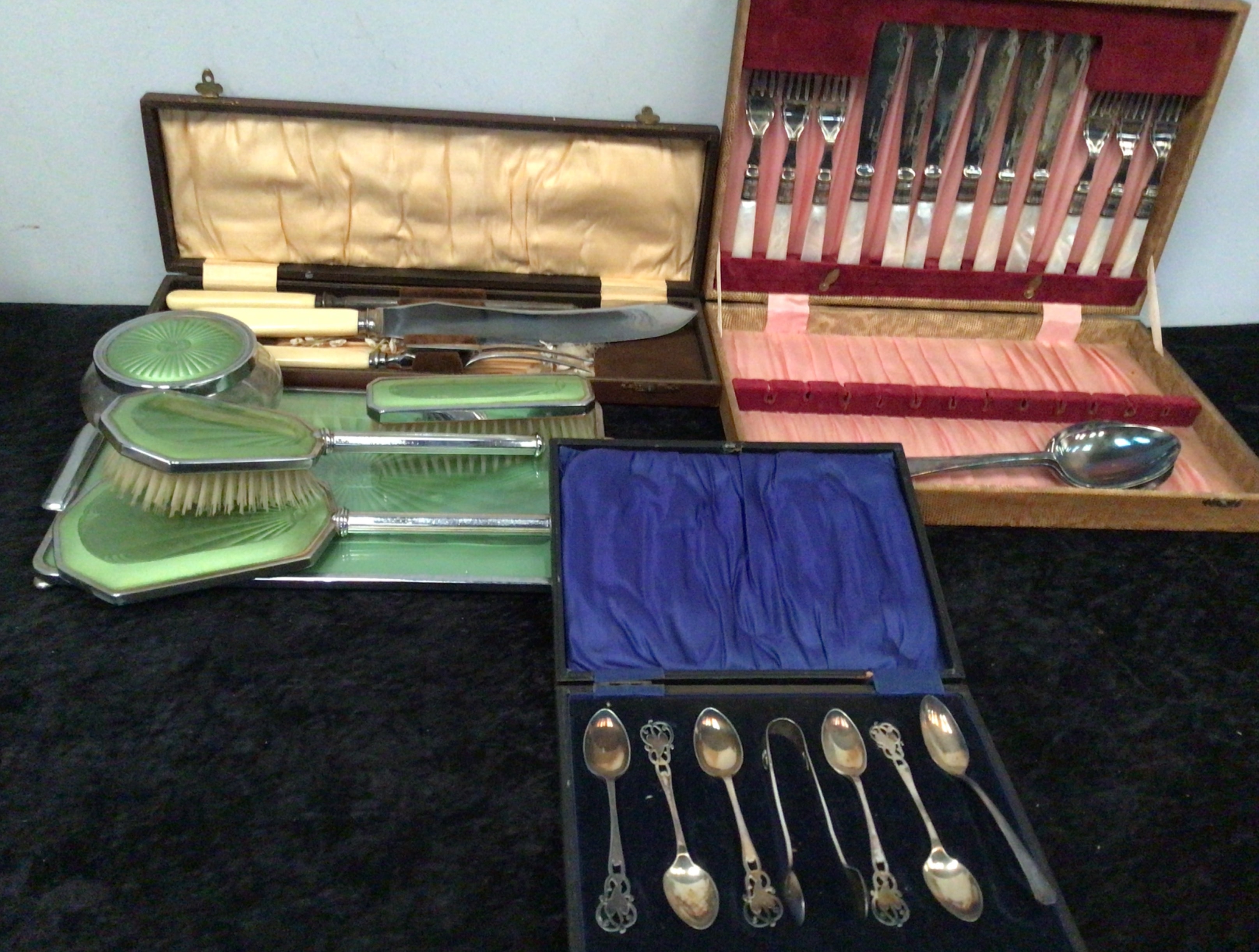 A collection comprising three distinct cased sets. The first, a partial flatware service, identified through web intelligence as Oneida Tudor Plate silver plate. This set includes knives and forks with white handles, likely mother-of-pearl or celluloid, alongside a single large serving spoon. It is housed in a wooden case lined with reddish-pink velvet.