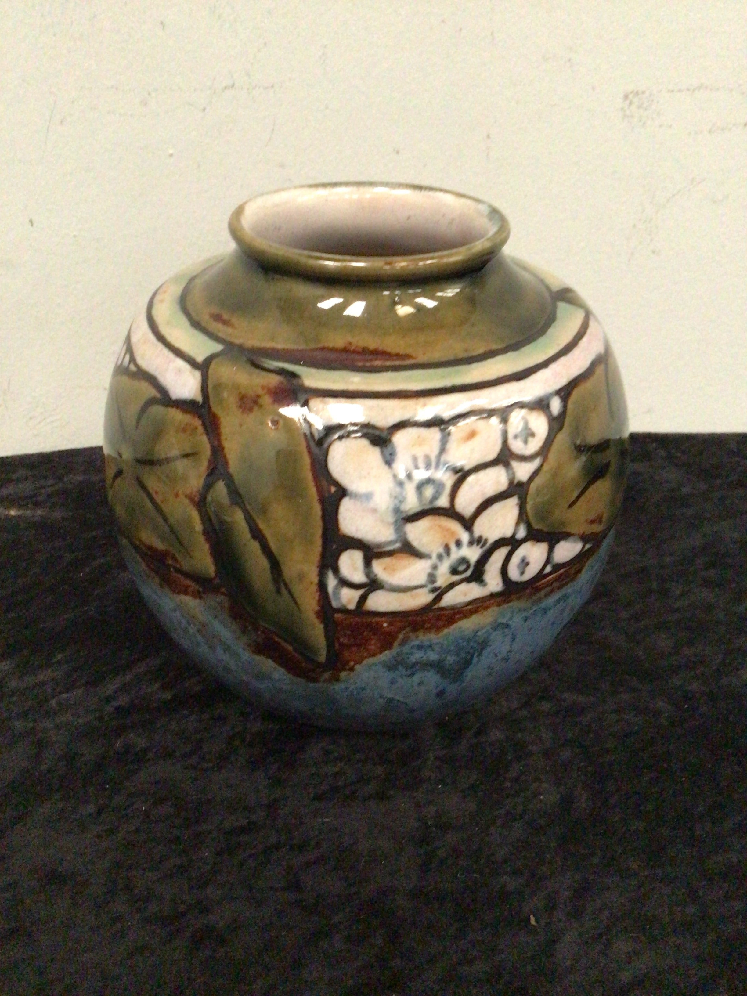 A Royal Doulton Stoneware Arts & Crafts vase of globular form, featuring a multi-color, glossy glaze. The decoration encompasses stylized floral and foliate motifs in shades of cream, light blue, and various greens, outlined in dark brown, against a mottled brown-green ground that transitions to a solid dark blue at the base. No visible text or manufacturer’s markings are present on the exterior surface.