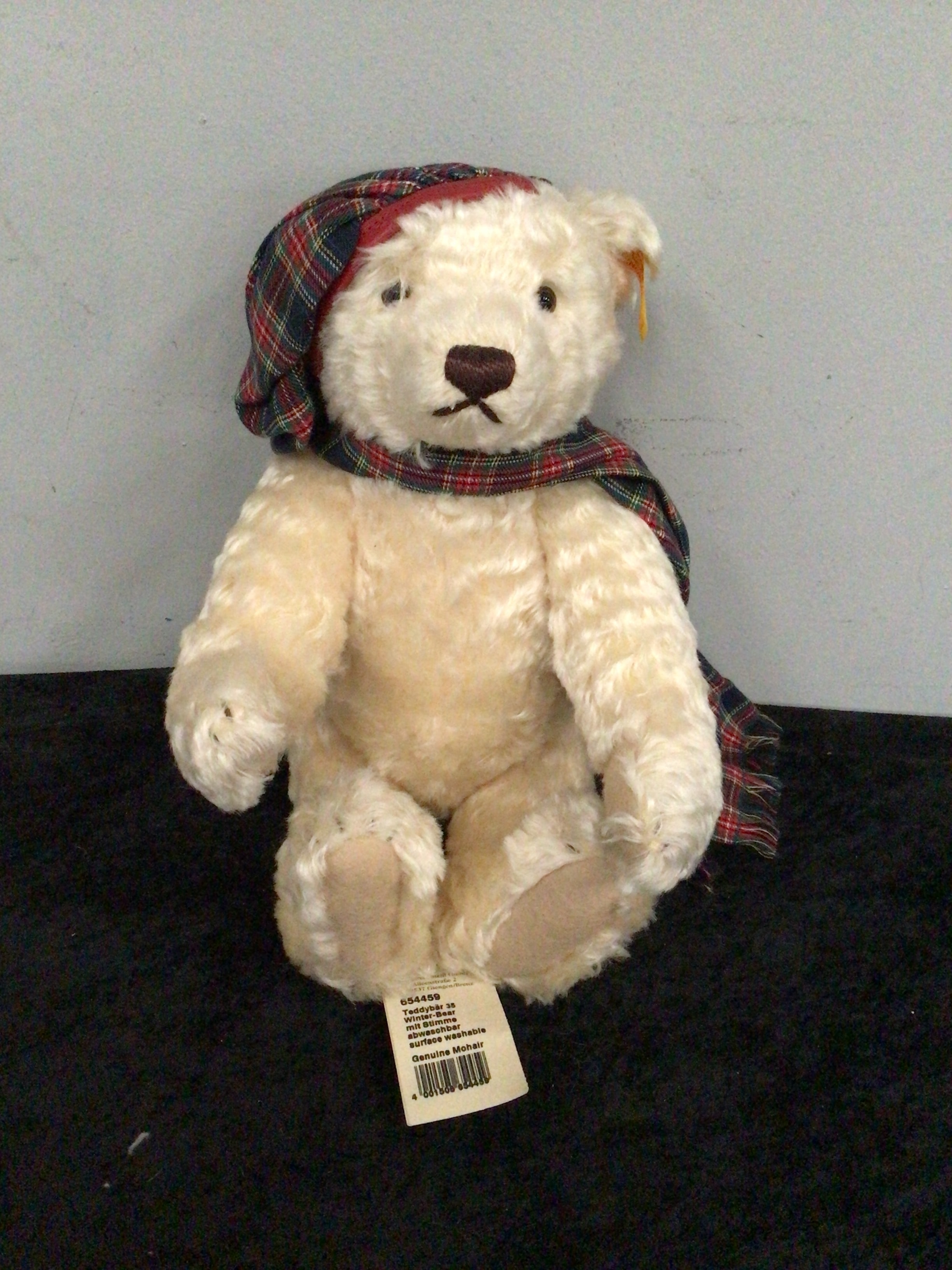A Steiff ‘Four Seasons Winter Colin’ growler teddy bear, model number 654459, circa 1998. Crafted from genuine cream-colored mohair, the bear features the iconic gold ‘Steiff Knopf im Ohr’ (Button in Ear) with a yellow fabric tag in its left ear. It is dressed in a red, green, and blue plaid hat and matching scarf. A white paper tag attached to its right foot identifies it as a ‘Margarete Steiff GmbH’ ‘Teddybär 35 Winter-Bear’, noting it has a ‘Stimme’ (voice/sound mechanism) and is ‘abwaschbar’ (surface washable).