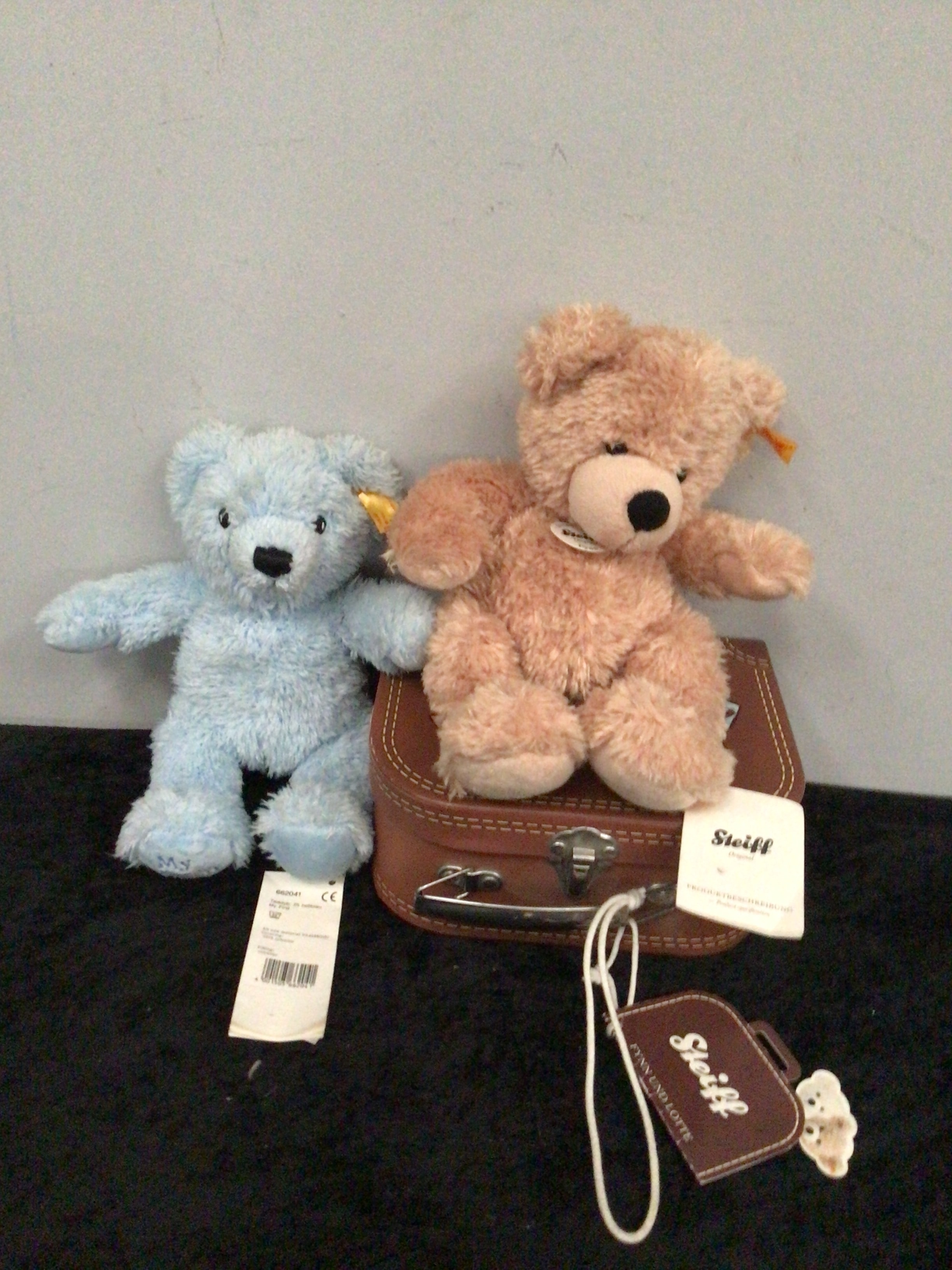 A pair of Steiff Fynn and Lotte teddy bears, comprising one light blue bear and one light brown bear. Both bears retain their original tags, with the light blue bear’s tag further specifying “Teddyb. 25 hellblau” and “My First,” indicating materials of 100% polyester for both covering and filling. The bears are accompanied by a small, brown faux-leather (or vinyl) suitcase with metal clasps, which also bears a “Steiff” tag with the text “Fynn und Lotte.”