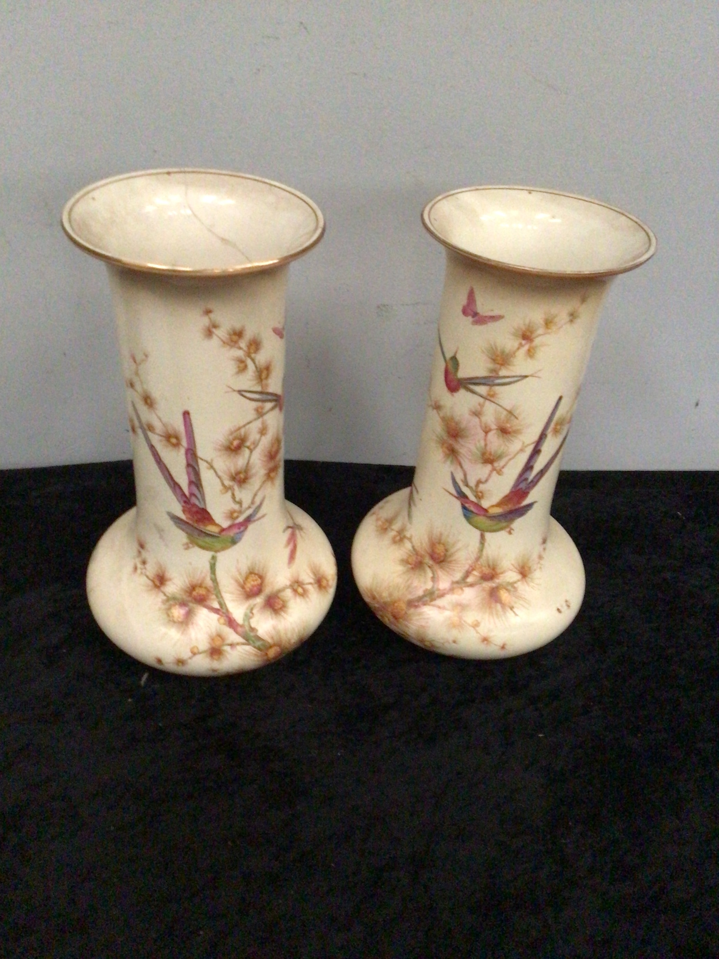 A pair of Crown Ducal Ware ‘Bird of Paradise’ vases. Each glazed ceramic vase features a flared trumpet-shaped neck and a wide, stout base. They are decorated on an off-white ground with polychrome depictions of small birds, butterflies, and flowering branches, accented with a gilded band around the rim. The underside of one vase bears a black printed mark, ‘CROWN DUCAL WARE ENGLAND’ surmounted by a crown motif.