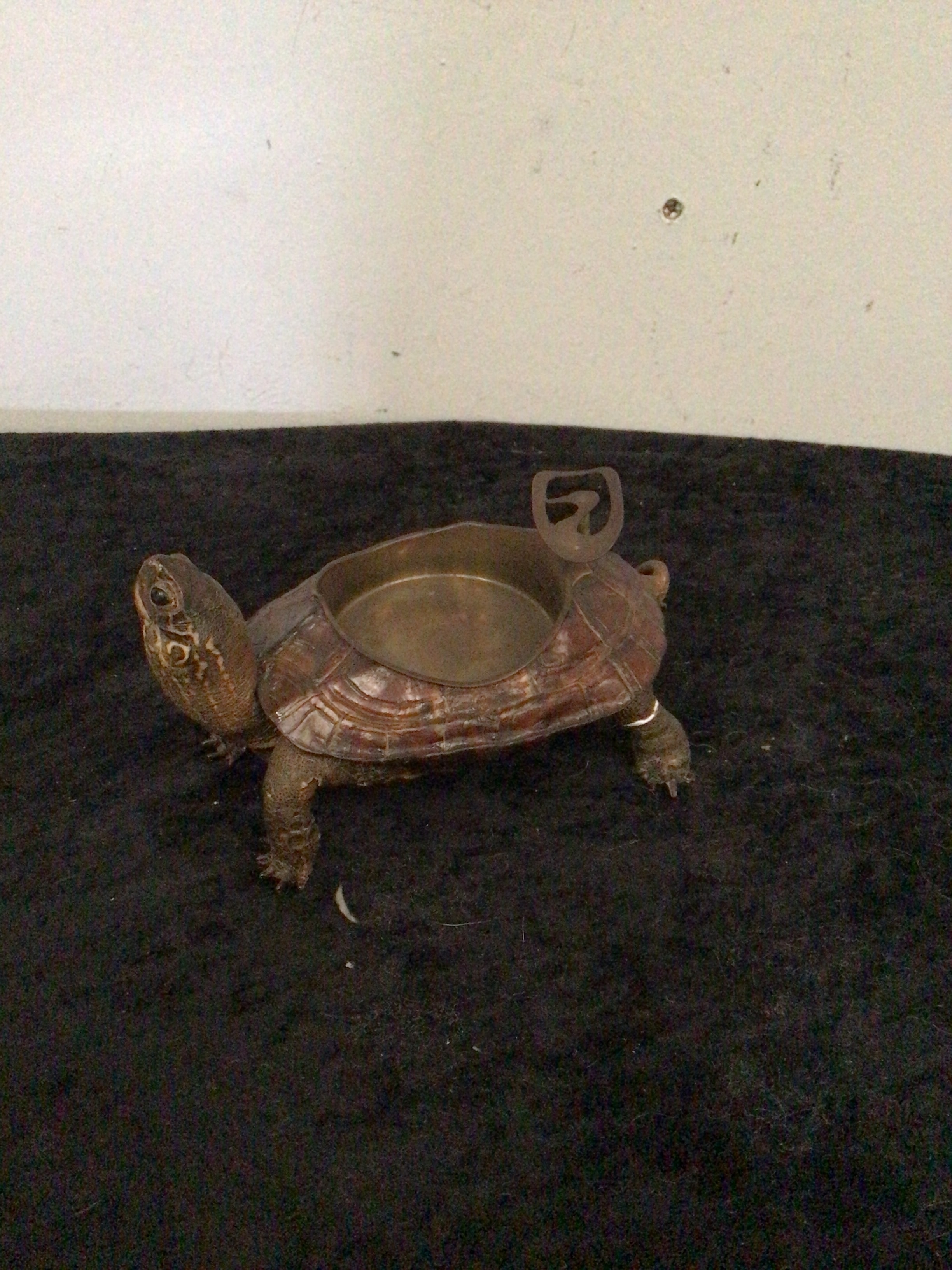 A decorative figural container fashioned from a real taxidermied turtle, featuring a shallow, oval metallic depression on its back, likely brass, serving as an ashtray. A D-shaped loop handle is present at the rear of its shell. The piece displays a dark, uneven finish consistent with aged taxidermy.