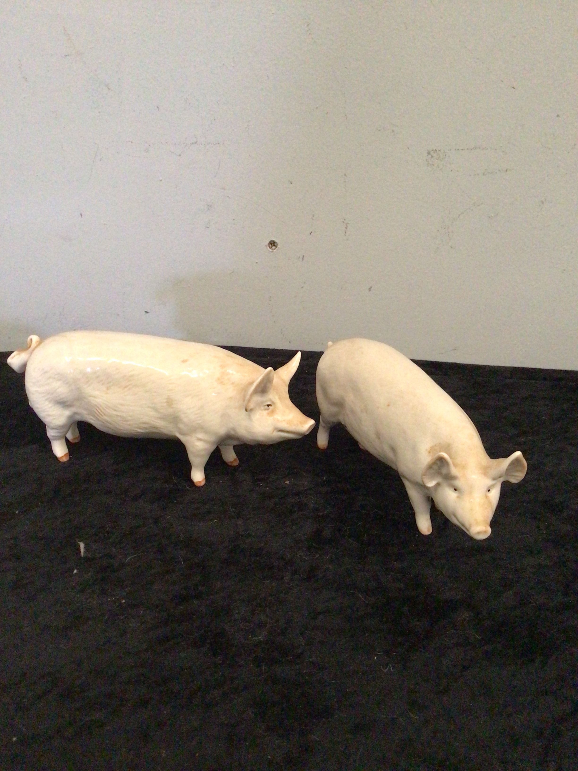 A pair of Beswick ‘Wall Pig’ figurines. Composed of Beswick, these glazed ceramic figurines are depicted in a realistic style with an off-white/cream finish and faint light brown markings on their backs. One figurine is marked “CH WALL Boy 93” and the other “CH WALL QUEEN 40”, likely referring to champion show pigs. Both objects bear the inverted manufacturer’s mark “BESWICK ENGLAND”.