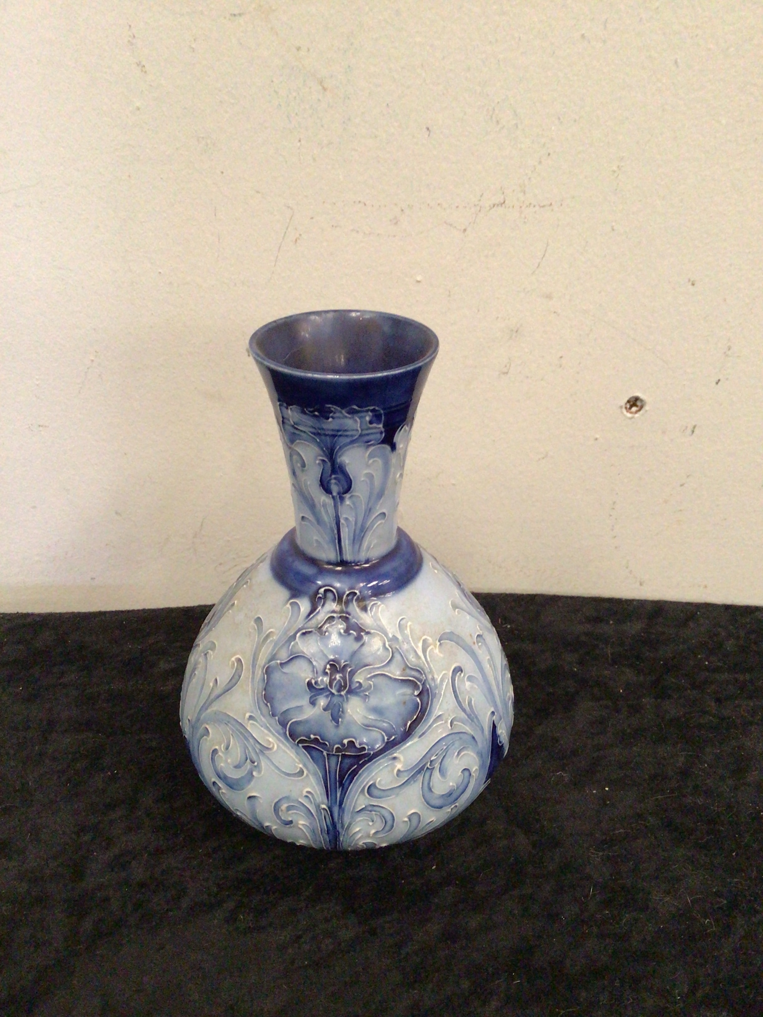 A William Moorcroft Florian Ware vase, circa 1900. This glazed ceramic vase, likely earthenware or stoneware, features a globular body with a tapering neck and flared rim. Its decoration exhibits prominent Art Nouveau characteristics, with intricate, raised, and flowing stylized floral and foliate motifs rendered in shades of cobalt blue and lighter blue on a white or cream ground. The base, showing minor wear on its unglazed footrim, is marked in reddish-brown text “FLORIAN KARE / A MONTREUIL S/S B/S / MADE IN FRANCE,” alongside abstract green brushstrokes.