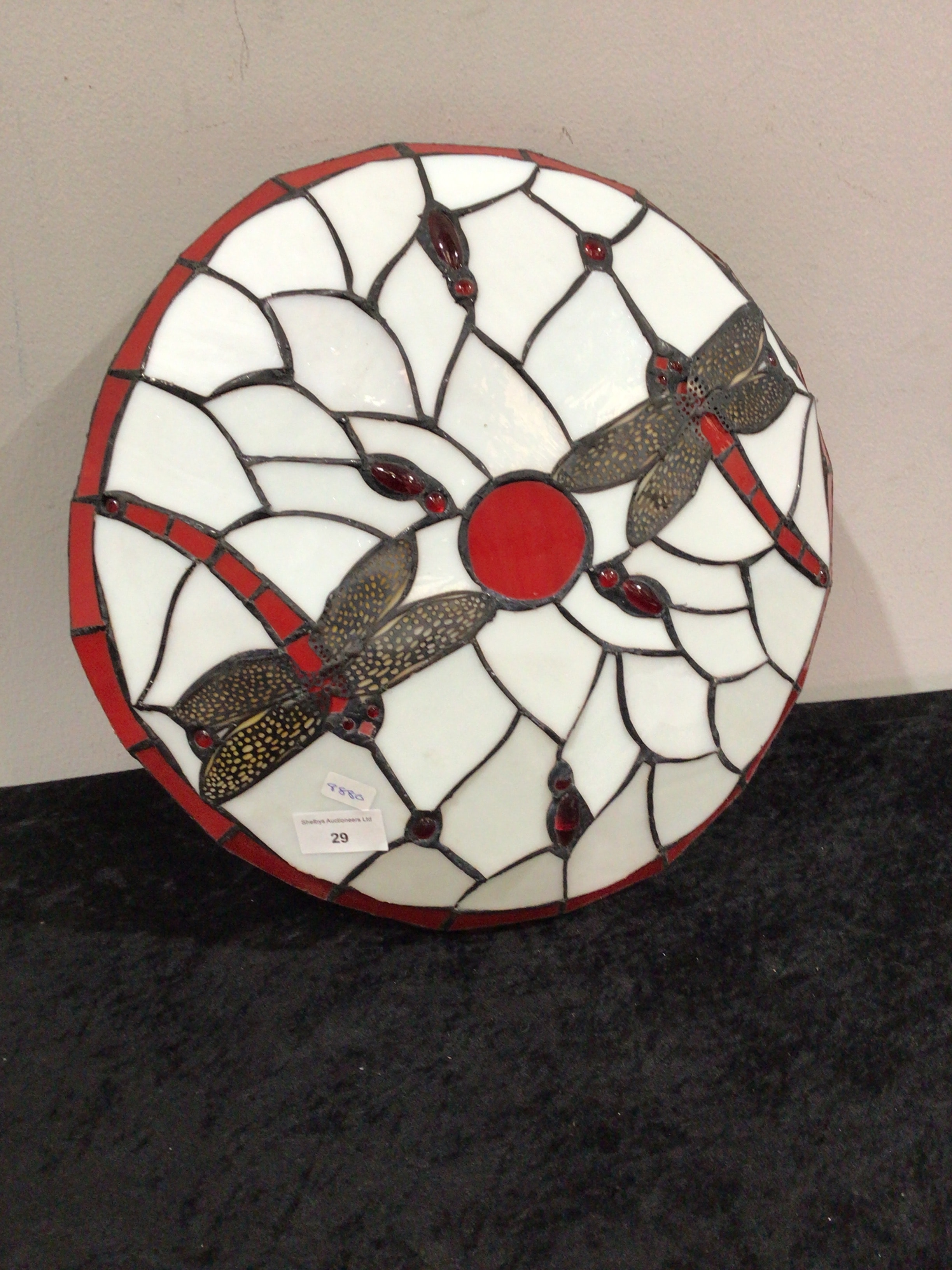 A modern Tiffany-style stained glass easy fit pendant shade. This circular shade features a predominantly white opaque glass background, with a central red circular element from which two stylized dragonflies extend. The dragonflies are rendered with mottled brown and cream wings and red bodies. Additional elongated red glass accents and small teardrop-shaped red glass pieces are integrated into the leaded composition, which is framed by a continuous red glass border. The construction consists of individual glass pieces joined by leaded lines. A white adhesive label is affixed to the front, bearing the text “TES,” “Stalkers Auctioneers Ltd,” and the number “29.” This item is a shade only, designed for easy fitting to an existing light fixture.