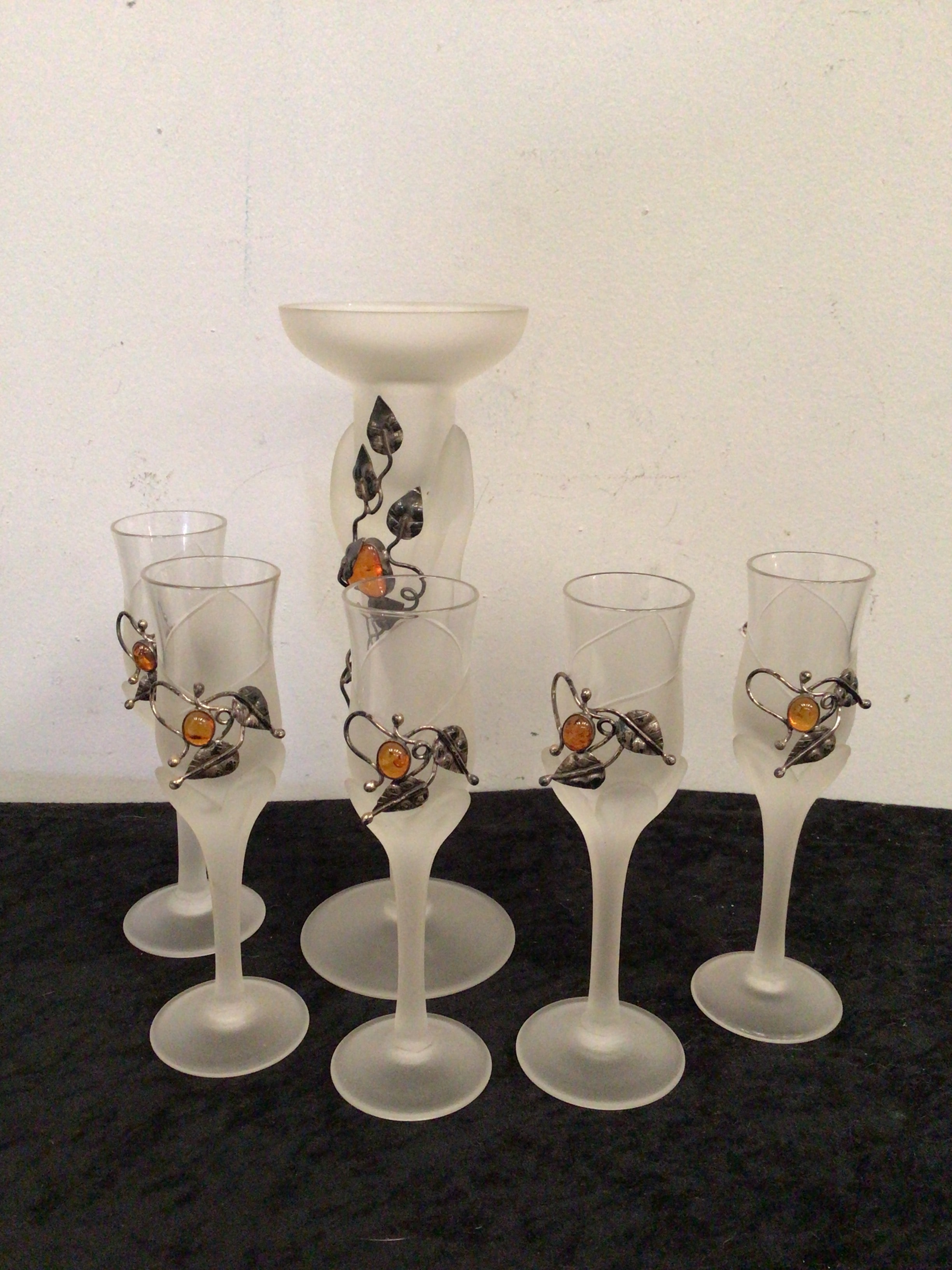 This six-piece set, crafted in an Art Nouveau style, comprises one central vase or candlestick and five matching stemmed cordial or liqueur glasses. Each item is made from frosted or satin-finished glass and adorned with applied metalwork and silver The metal embellishments feature a botanical design with scrolling vines and leaves, incorporating spherical, amber cabochon No visible text or manufacturer’s markings are discernible.