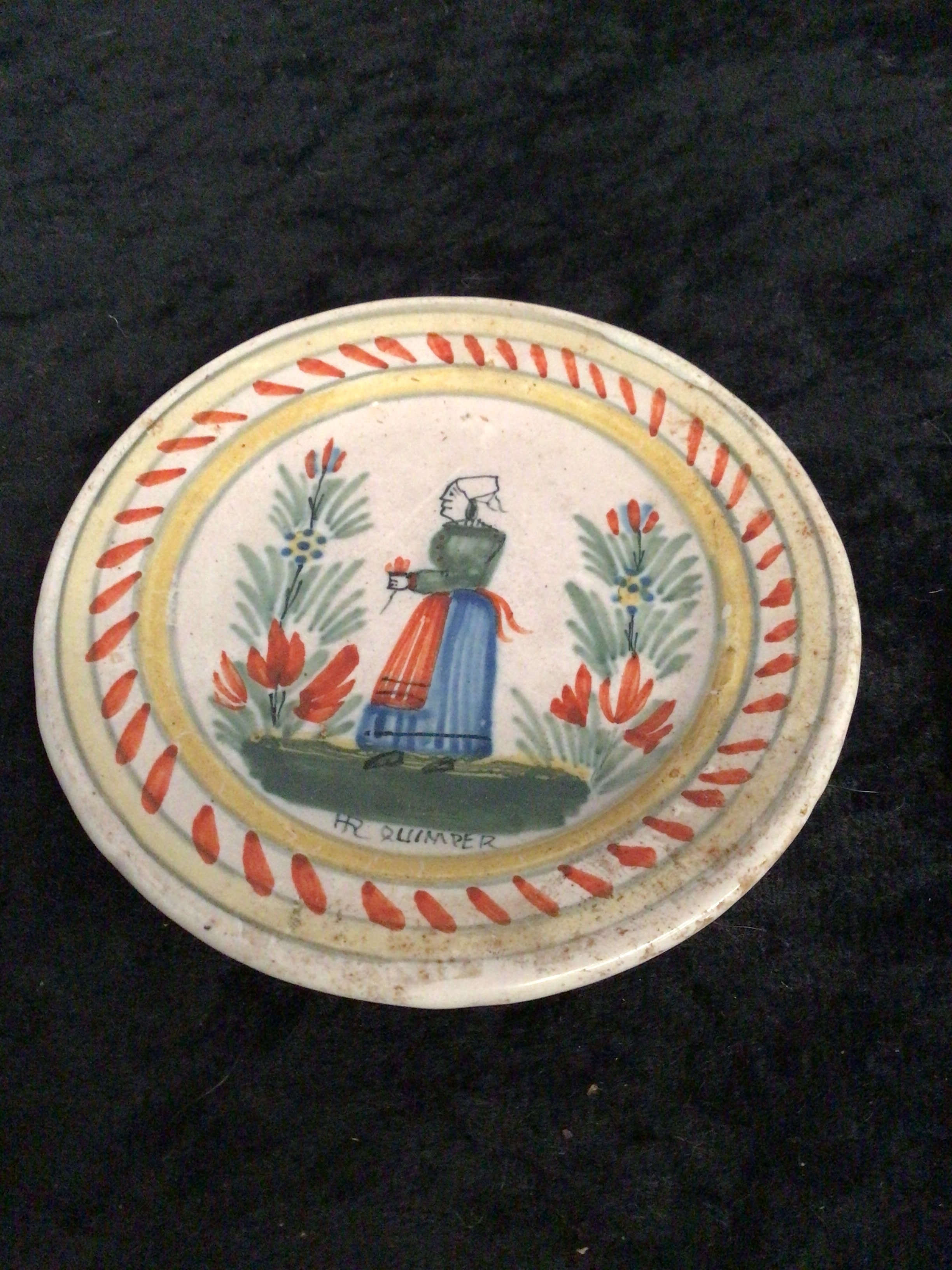 Three 19th Century Henriot Quimper faience plates, crafted from Quimper. These small, round plates are characteristic of Quimper faience, featuring a creamy white glazed earthenware ground. Each plate is hand-painted in polychrome (red, green, blue, yellow, black) in a folk art style. The central motif on one plate depicts a female figure in traditional Breton costume, while the other features a male figure, both surrounded by stylized floral elements. A decorative border of concentric yellow bands and red dash patterns frames the central scene. Both items bear the black script marking ‘HR QUIMPER’ on the front, consistent with Henriot Quimper production.