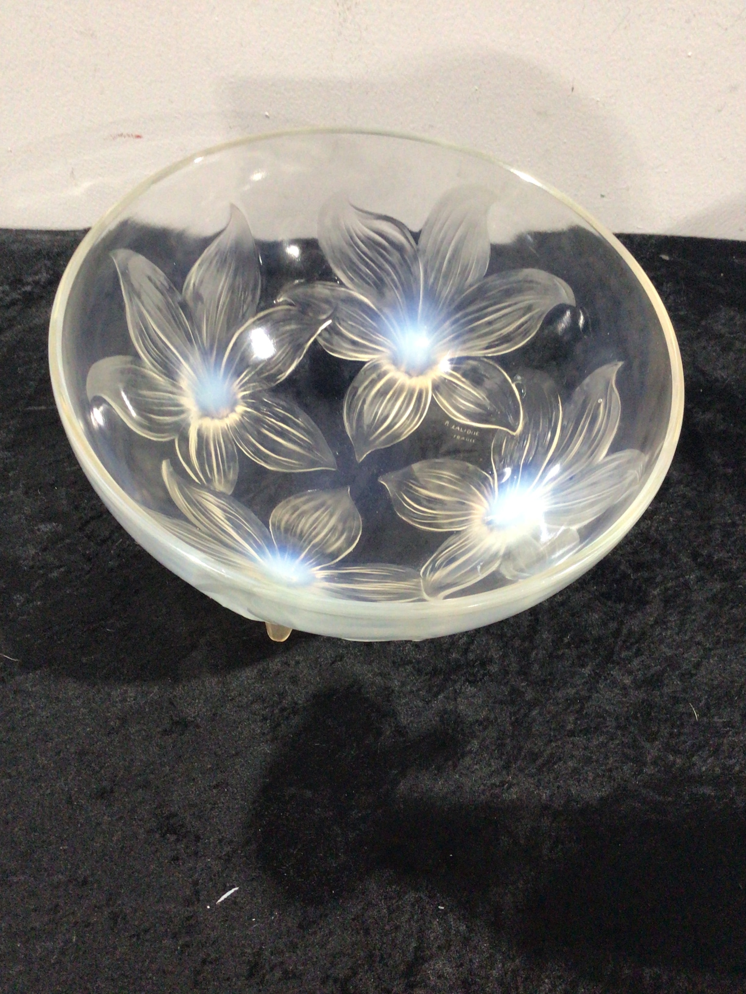 A René Lalique ‘Lys’ opalescent molded glass bowl. This round, three-footed bowl features deeply molded, stylized floral motifs on the interior, with the relief visible on the exterior. It exhibits a luminous blue-white opalescence when lit. The interior surface bears the impressed mark ‘R. LALIQUE FRANCE’.