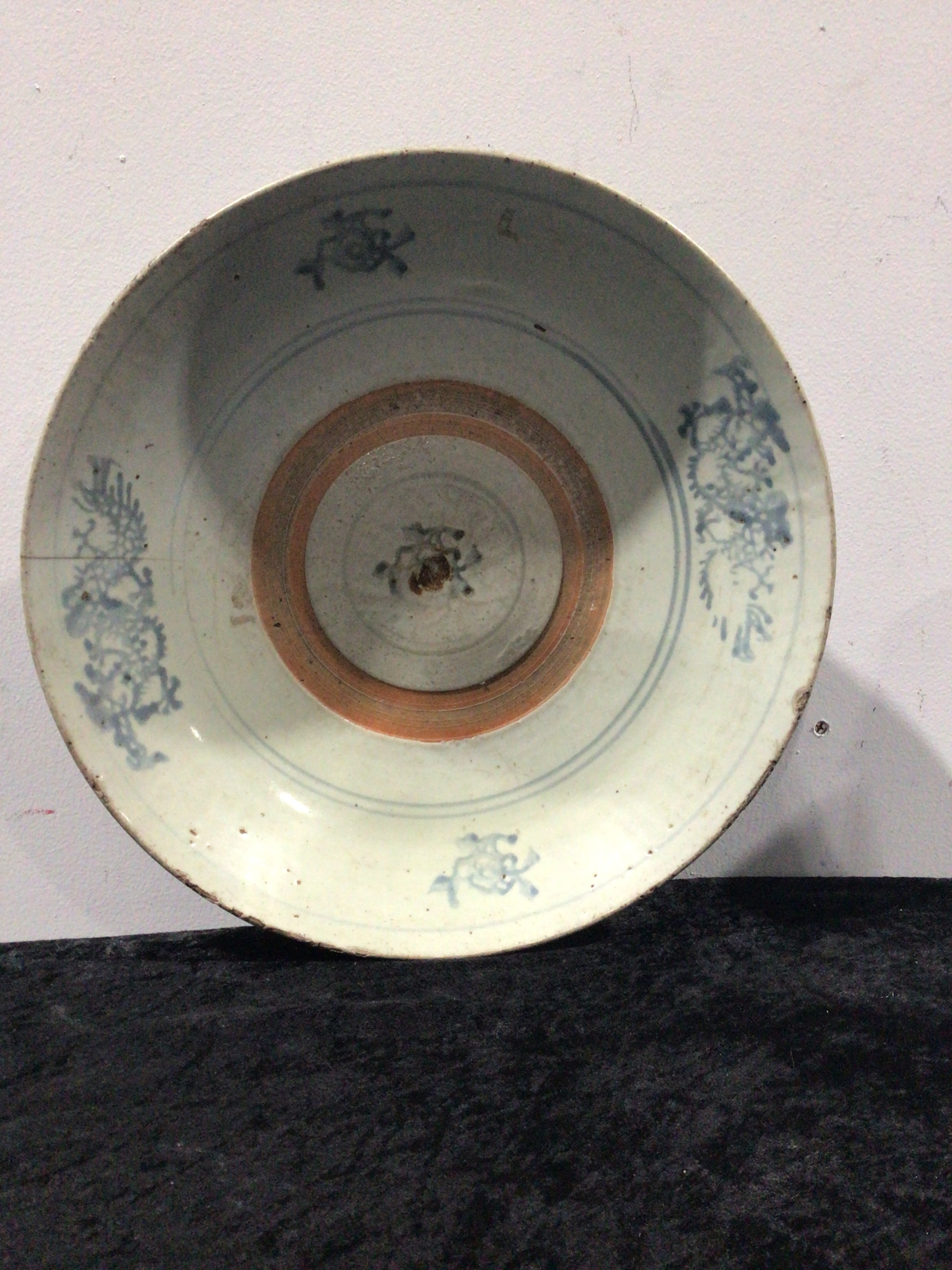 A circular, shallow ceramic plate, crafted from white-glazed ware with exposed reddish-brown biscuit on its base. The interior features a central blue motif, possibly floral or symbolic, encircled by concentric blue lines, and further adorned with a band of repeating floral or foliate designs on the cavetto, along with smaller stylized blue motifs near the rim. The reverse reveals a broad, unglazed reddish-brown foot rim and central base, the latter also bearing a small blue motif and heavy discoloration.